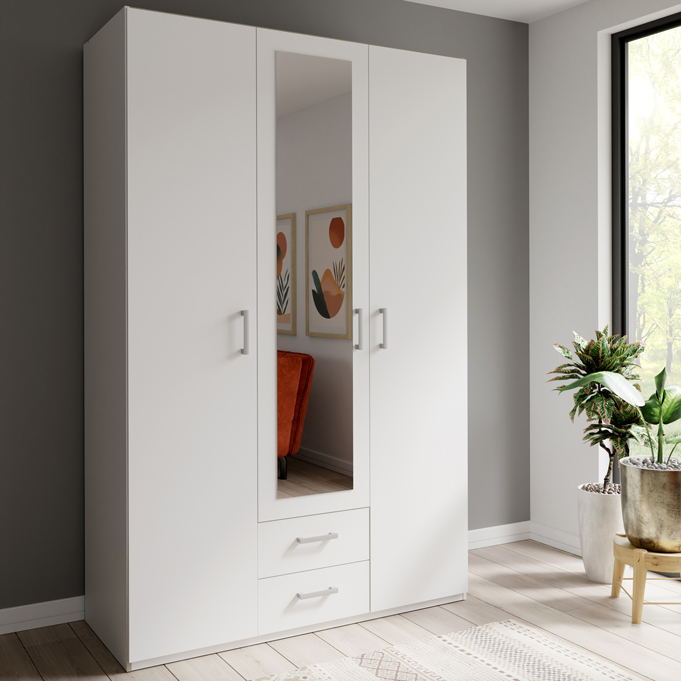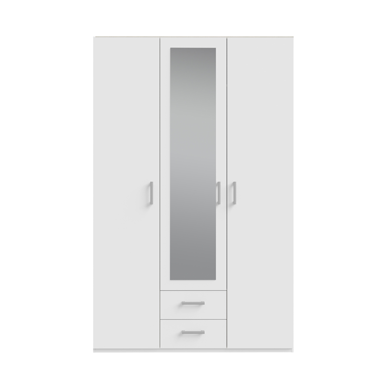 Ντουλάπα ανοιγόμενη τρίφυλλη με καθρέπτη Jakrine pakoworld μελαμίνη λευκή με 3 ράφια γκρι 133.2×54.2×210.5εκ Εάν ψάχνετε μια μεγάλη ντουλάπα για να τακτοποιήσετε όλα σας τα ρούχα και αξεσουάρ η ντουλάπα Jakrine είναι η ιδανική επιλογή. Κλασσική γραμμή και κατασκευή από ποιοτικά υλικά με μεγάλους χώρους αποθήκευσης που την καθιστούν αναγκαία και απαραίτητη για κάθε χώρο. Τεχνικά χαρακτηριστικά: Κατασκευασμένη από μοριοσανίδα επενδυμένη με μελαμίνη υψηλής ποιότητας, με αντοχή στην καταπόνηση και στον χρόνο. Προσφέρεται σε χρώμα λευκό. Περιλαμβάνει τρεις πόρτες, εσωτερικά φέρει ράγες για κρεμάστρες και κάτω δύο συρτάρια για την αποθήκευση ρούχων και αξεσουάρ. Τα πόμολα είναι κατασκευασμένα από εξαιρετικής ποιότητας pp. Τεχνικά χαρακτηριστικά ραφιών: Σετ 3 τεμαχίων. Κατασκευή από μοριοσανίδα με επένδυση μελαμίνης υψηλής ποιότητας, με αντοχή στην καταπόνηση, την φθορά και τον χρόνο. Προσφέρεται σε χρώμα γκρι.Διαστάσεις ντουλάπας: Μήκος: 133.2 εκ. Πλάτος: 54.2 εκ. Ύψος: 210.5 εκ. Βάρος αντοχής ράγας: 25 kg. Βάρος αντοχής συρταριού: 5 kg. Διαστάσεις ραφιών: Μήκος: 42.2 εκ. Πλάτος: 1.5 εκ. Ύψος: 42 εκ. Βάρος αντοχής ραφιών: 15 kg.Πληροφορίες υλικών: Μοριοσανίδα: Η μοριοσανίδα, γνωστή ως chipboard, είναι ένα σύνθετο ξύλινο υλικό που κατασκευάζεται από μικρά κομματάκια ξύλου, συνήθως πεύκου ή ελάτης, κολλημένα μαζί υπό υψηλή πίεση και θερμοκρασία με τη χρήση ρητινών. Χρησιμοποιείται ευρέως στην κατασκευή επίπλων, εσωτερικών επιφανειών και δομικών εφαρμογών. Κατασκευάζεται από ανακυκλωμένα υλικά και είναι ανθεκτική σε καμπύλες, τριβές και άλλες φυσικές καταπονήσεις. Μελαμίνη: Η μελαμίνη LPB (Low Pressure Melamine) είναι ένα συνθετικό υλικό που χρησιμοποιείται ευρέως στην επιφανειακή επεξεργασία μοριοσανίδας στην κατασκευή επίπλων και επιφανειών, λόγω της ανθεκτικότητάς της και της ευκολίας στη συντήρηση. Εφαρμόζεται σε υποστρώματα όπως το MDF (Medium-density fibreboard/ινοσανίδα) ή το κόντρα πλακέ OSB για να παράγει ανθεκτικές επιφάνειες. Οδηγίες συντήρησης: Μοριοσανίδα: Για τον καθαρισμό της μοριοσανίδας, μπορείτε να χρησιμοποιήσετε ένα μαλακό πανί ελαφρά εμποτισμένο με νερό και ήπιο απορρυπαντικό. Αποφύγετε την υπερβολική χρήση νερού και διατηρήστε την επιφάνεια στεγνή μετά τον καθαρισμό. Μελαμίνη: Ένα από τα πιο γνωστά υλικά στον χώρο του επίπλου είναι η μελαμίνη. Για να αφαιρέσετε τους λεκέδες από την επιφάνεια χρησιμοποιείστε ένα μαλακό πανί με χλιαρό νερό και ήπιο σαπούνι. Σκουπίστε απαλά την επιφάνεια μέχρι να αφαιρεθεί ο λεκές. Η μελαμίνη είναι ευαίσθητη στην υγρασία, επομένως είναι σημαντικό να την προστατεύετε από το νερό.Παρατηρήσεις: Το προϊόν παραδίδεται σε εργοστασιακή συσκευασία. Η χρωματική απόχρωση του προϊόντος ενδέχεται να διαφέρει ελαφρώς σε σχέση με την φωτογραφική απεικόνισή του στην οθόνη σας.