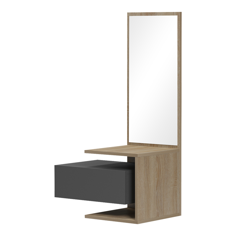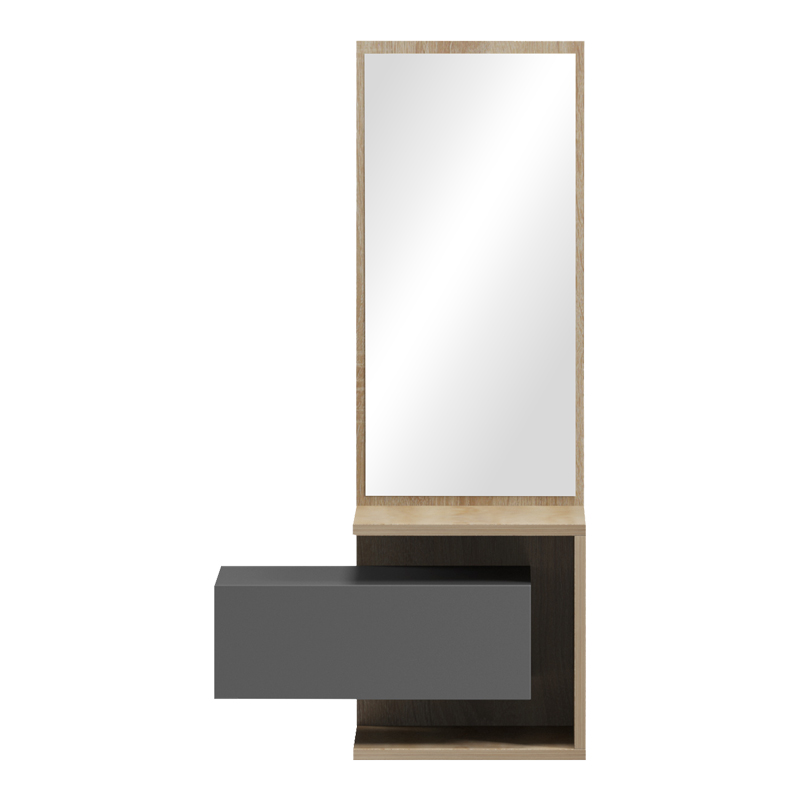 Έπιπλο εισόδου Kendi pakoworld επιτοίχιο με καθρέπτη σε sonoma- ανθρακί 49.1×31.3×90εκ Η νέα τάση για την οργάνωση του χώρου σας , το επιτοίχιο έπιπλο εισόδου Kendi! Ένα έπιπλο υψηλής αισθητικής, αποτελεί μια εξαιρετική επιλογή για όσους αναζητούν μια ολοκληρωμένη, πρακτική και αισθητικά αναβαθμισμένη λύση. Τεχνικά χαρακτηριστικά: Κατασκευασμένο από μοριοσανίδα με επένδυση μελαμίνης υψηλής ποιότητας, με αντοχή στην καταπόνηση και στον χρόνο. Διατίθεται σε διχρωμία ανθρακί-sonoma, δημιουργώντας μια εντυπωσιακή αντίθεση. Eφάπτει στον τοίχο σας για μεγαλύτερη εξοικονόμηση χώρου. Μπορεί να τοποθετηθεί σε οποιοδήποτε ύψος του τοίχου σας εξυπηρετεί, προσφέροντας σας εργονομία και άνεση. Διαθέτει συρτάρι για έξτρα χώρο αποθήκευσης των αντικειμένων σας.Διάσταση προϊόντος: Μήκος: 49.10 εκ. Πλάτος: 31.3 εκ. Ύψος: 90 εκ. Μήκος καθρέπτη: 29.5 εκ Μήκος συρταριού: 40 εκ Ύψος συρταριου: 14.5 εκΠληροφορίες υλικών: Μοριοσανίδα (Chipboard): Η μοριοσανίδα, γνωστή ως chipboard, είναι ένα σύνθετο ξύλινο υλικό που κατασκευάζεται από μικρά κομματάκια ξύλου, συνήθως πεύκου ή ελάτης, κολλημένα μαζί υπό υψηλή πίεση και θερμοκρασία με τη χρήση ρητινών. Χρησιμοποιείται ευρέως στην κατασκευή επίπλων, εσωτερικών επιφανειών και δομικών εφαρμογών. Κατασκευάζεται από ανακυκλωμένα υλικά και είναι ανθεκτική σε καμπύλες, τριβές και άλλες φυσικές καταπονήσεις. Μελαμίνη (LPB): Η μελαμίνη LPB (Low Pressure Melamine) είναι ένα συνθετικό υλικό που χρησιμοποιείται ευρέως στην επιφανειακή επεξεργασία μοριοσανίδας στην κατασκευή επίπλων και επιφανειών, λόγω της ανθεκτικότητάς της και της ευκολίας στη συντήρηση. Εφαρμόζεται σε υποστρώματα όπως το MDF (Medium-density fibreboard/ινοσανίδα) ή το κόντρα πλακέ OSB για να παράγει ανθεκτικές επιφάνειες. Οδηγίες συντήρησης: Μοριοσανίδα (Chipboard): Για τον καθαρισμό της μοριοσανίδας, μπορείτε να χρησιμοποιήσετε ένα μαλακό πανί ελαφρά εμποτισμένο με νερό και ήπιο απορρυπαντικό. Αποφύγετε την υπερβολική χρήση νερού και διατηρήστε την επιφάνεια στεγνή μετά τον καθαρισμό. Μελαμίνη (LPB): Για να αφαιρέσετε τους λεκέδες από την επιφάνεια χρησιμοποιείστε ένα μαλακό πανί με χλιαρό νερό και ήπιο σαπούνι. Σκουπίστε απαλά την επιφάνεια μέχρι να αφαιρεθεί ο λεκές. Η μελαμίνη είναι ευαίσθητη στην υγρασία, επομένως είναι σημαντικό να την προστατεύετε από το νερό.Παρατηρήσεις: Το προϊόν παραδίδεται αμοντάριστο, σε εργοστασιακή συσκευασία και με αναλυτικό οδηγό συναρμολόγησης. Η χρωματική απόχρωση του προϊόντος ενδέχεται να διαφέρει ελαφρώς σε σχέση με την φωτογραφική απεικόνισή του στην οθόνη σας.