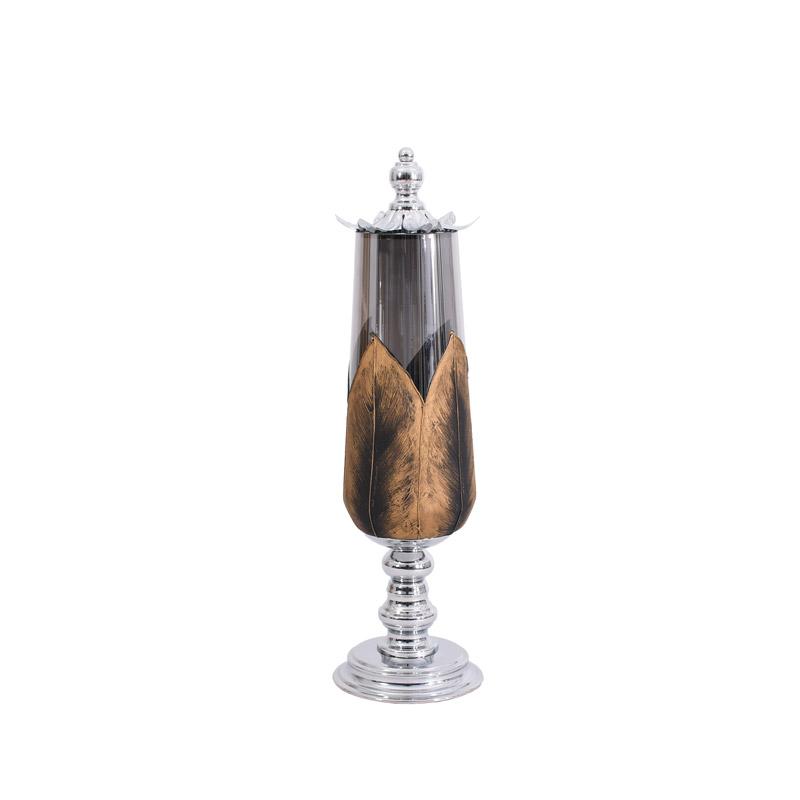 ΓΥΑΛΙΝΟ ΒΑΖΟ ΜΕ ΚΑΠΑΚΙ ΚΑΙ ΜΕΤΑΛΛΙΚΟ ΠΟΔΙ Fylliana FL106 ΜΑΥΡΟ-ΑΣΗΜΙ ΧΡΩΜΑ 14×50εκ –