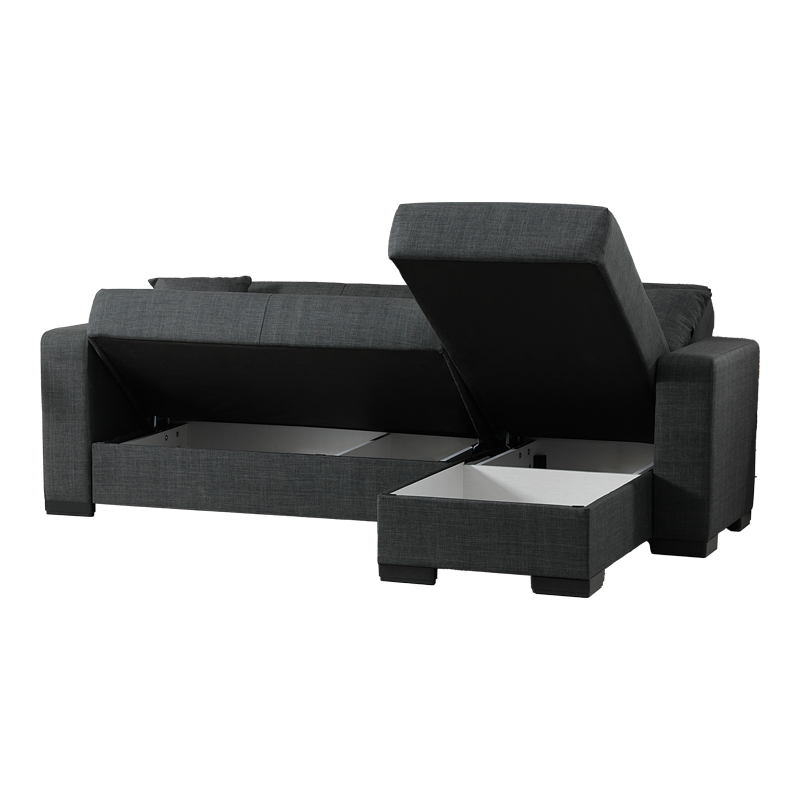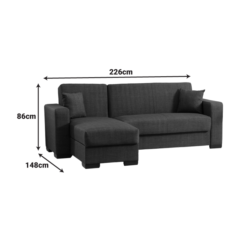 Γωνιακός καναπές-κρεβάτι αναστρέψιμος Dumma pakoworld ύφασμα ανθρακί 226x148x86εκ Ο γωνιακός καναπές-κρεβάτι Dumma, συνδυάζει μοντέρνο στυλ, άνεση και πολυλειτουργικότητα, ιδανική για σύγχρονους χώρους.Είναι η ιδανική επιλογή για όσους αναζητούν έναν κομψό, συμπαγή και πλήρως λειτουργικό γωνιακό καναπέ-κρεβάτι που προσφέρει λύσεις αποθήκευσης και άνεσης, χωρίς συμβιβασμούς στην αισθητική.Τεχνικά χαρακτηριστικά Κατασκευασμένος εσωτερικά από ενισχυμένο σκελετό με αντοχή στο βάρος, στη φθορά και στο χρόνο. Εσωτερικά φέρει ελατήρια που βοηθούν τον καναπέ να διατηρήσει το σχήμα του και προσθέτουν αντοχή στην κατασκευή. Φέρει εύχρηστο μηχανισμό που με μία μόνο κίνηση ανασηκώνεται, μετατρέποντας τον καναπέ σε κρεβάτι και το αντίστροφο. Φέρει αποθηκευτικό χώρο-μπαούλο . Η κλειστή αποθήκευση των αντικειμένων σας γίνεται πιο εύκολη από ποτέ. Αναστρέψιμος ώστε να μπορεί άμεσα να προσαρμοστεί σε όποια γωνία σας εξυπηρετεί. Foam για άνεση στο κάθισμα. Επένδυση με εξαιρετικής ποιότητας ύφασμα μεγάλης ανθεκτικότητας σε ανθρακί χρώμαΔιάσταση προϊόντος:Διάσταση καναπέ: Μήκος: 226 εκ. Πλάτος: 148 εκ. Ύψος: 86 εκ.Διάσταση κρεβατιού 226x180x63 εκΠαρατηρήσεις: Το προϊόν παραδίδεται σε εργοστασιακή συσκευασία με αναλυτικό οδηγό συναρμολόγησης Η χρωματική απόχρωση του προϊόντος ενδέχεται να διαφέρει ελαφρώς σε σχέση με την φωτογραφική απεικόνισή του στην οθόνη σας.