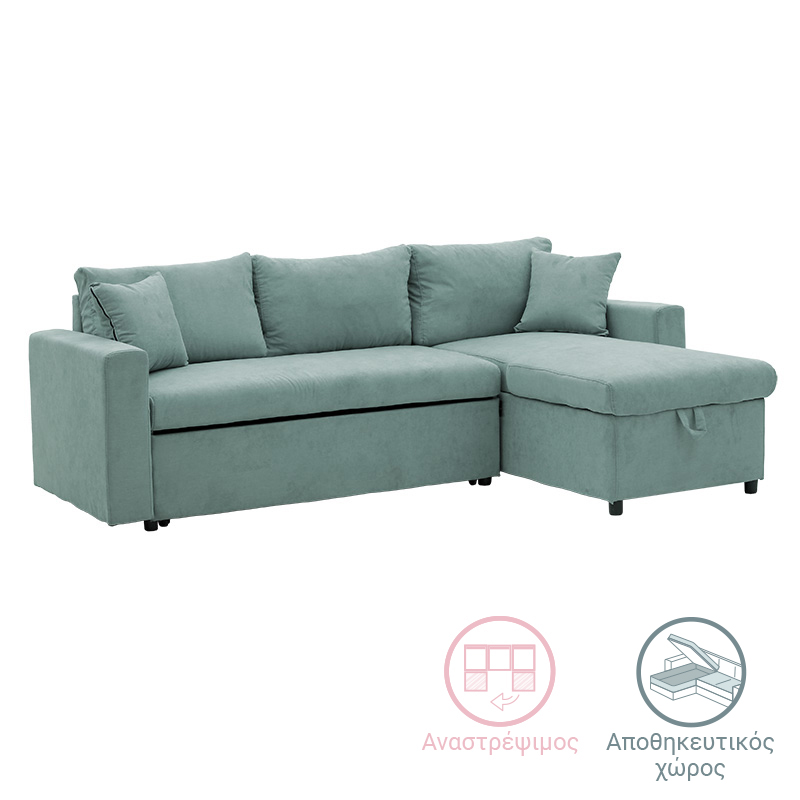 Γωνιακός καναπές-κρεβάτι αναστρέψιμος Lilian pakoworld ύφασμα πράσινο μέντας 225x148x81εκ