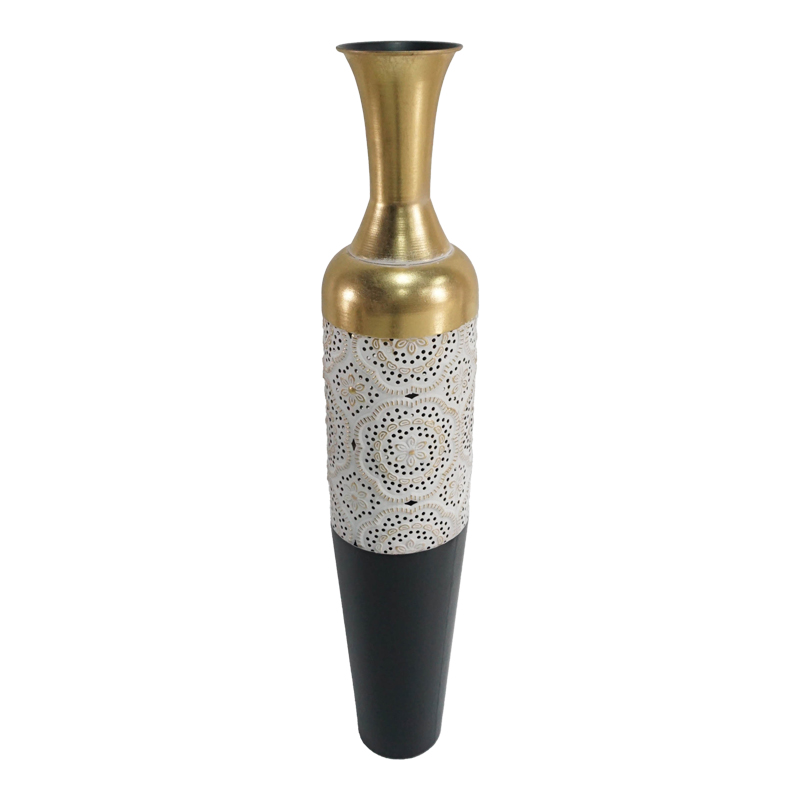 Διακοσμητικό βάζο δαπέδου Balan Inart μέταλλο σε χρυσή, μαύρη και λευκή απόχρωση Φ16.5×88.3εκ Εάν ψάχνεις να διακοσμήσεις το χώρο σου με ένα διακοσμητικό βάζο απαράμιλλης αισθητικής, υψηλής ποιότητας και μοντέρνου design τότε η επιλογή Balan θα σε καταπλήξει.Τεχνικά χαρακτηριστικά: Κατασκευή από μέταλλο εξαιρετικής ποιότητας. Προσφέρεται σε χρυσή-λευκή-μαύρη απόχρωση.Διαστάσεις προϊόντος: Μήκος: 16.5 εκ. Πλάτος: 16.5 εκ. Ύψος: 88.3 εκ.Πληροφορίες υλικών: Μέταλλο: Το μέταλλο χρησιμοποιείται ευρέως στην κατασκευή επίπλων, προσφέροντας μια σειρά από πλεονεκτήματα σε σχέση με άλλα υλικά. Είναι εξαιρετικά ανθεκτικό σε φθορές, ιδανικό για έπιπλα που προορίζονται για καθημερινή χρήση σε ένα απαιτητικό περιβάλλον. Διατηρεί το σχήμα και τη δομή του άψογα, εξασφαλίζοντας σταθερότητα και μακροζωία στα έπιπλα. Εκτός από τις ιδιότητες που αναφέρθηκαν παραπάνω, το μέταλλο μπορεί να έχει και άλλα χαρακτηριστικά, όπως η αντιμικροβιακή δράση (χαλκός) ή υπεραγωγιμότητα (μολυβδένιο).Οδηγίες συντήρησης: Μέταλλο: Εάν πρόκειται για οποιοδήποτε μέταλλο εσωτερικού χώρου, ένα ξεσκόνισμα ή ένα καθάρισμα με υγρό πανί σε τακτά χρονικά διαστήματα είναι η ενδεδειγμένη επιλογή.Παρατηρήσεις: Το προϊόν παραδίδεται στην εργοστασιακή του συσκευασία. Η χρωματική απόχρωση του προϊόντος ενδέχεται να διαφέρει ελαφρώς σε σχέση με την φωτογραφική απεικόνισή του στην οθόνη σας.
