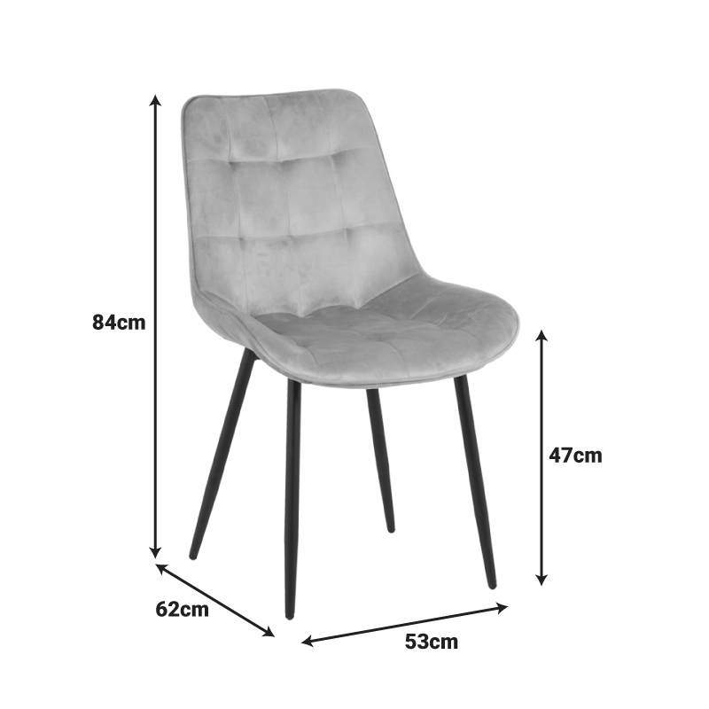 Καρέκλα Berne pakoworld βελούδο σε γκρί απόχρωση 53x62x84εκ Κομψή Βελούδινη Καρέκλα Τραπεζαρίας Η καρέκλα BERNE χαρακτηρίζεται από έναν συνδυασμό μοντέρνου σχεδιασμού και άνεσης, ιδανική για να αναβαθμίσει κάθε χώρο. Η λιτή της γραμμή την καθιστά εξαιρετικά ευέλικτη, ταιριάζοντας άψογα σε μια ποικιλία στυλ διακόσμησης, από μοντέρνο και μίνιμαλ έως πιο εκλεκτικό.Ιδανική ως καρέκλα τραπεζαρίας για καθημερινή χρήση ή επίσημες περιστάσεις, καθώς και ως καρέκλα επισκέπτη σε γραφεία, χώρους αναμονής ή καθιστικά.Προσφέρει όχι μόνο αισθητική αναβάθμιση, αλλά και άνεση χάρη στον προσεγμένο σχεδιασμό της.Τεχνικά χαρακτηριστικά: Επένδυση με βελούδο εξαιρετικής ποιότητας σε γκρι χρώμα προσδίδει μια πολυτελή αίσθηση και απαλή υφή Σκελετός από μεταλλική κατασκευή υψηλής αντοχής, με ηλεκτροστατική βαφή σε μαύρο χρώμα. Το κάθισμα και η πλάτη διαθέτουν διακριτικές ραφές σε μοτίβο καπιτονέ, προσφέροντας επιπλέον οπτικό ενδιαφέρον και εργονομική υποστήριξη. Ενδείκνυται για εσωτερικούς χώρους, αλλά και για χρήση: γραφείου, καταλυμάτων, Airbnb.Διαστάσεις προϊόντος: Μήκος: 53 εκ. Πλάτος: 62 εκ. Ύψος: 84 εκ. Ύψος έδρας: 47 εκ.Παρατηρήσεις: Το προϊόν παραδίδεται αμοντάριστο, σε εργοστασιακή συσκευασία και με αναλυτικό οδηγό συναρμολόγησης. Η χρωματική απόχρωση του προϊόντος ενδέχεται να διαφέρει ελαφρώς σε σχέση με την φωτογραφική απεικόνισή του στην οθόνη σας.