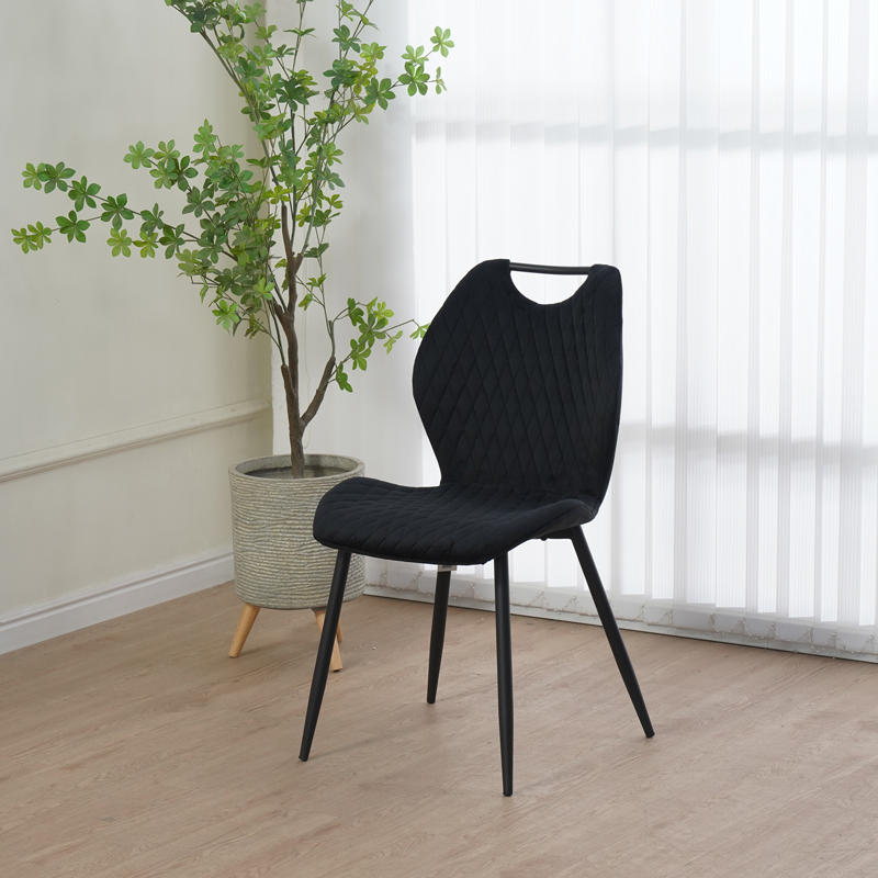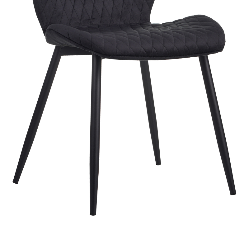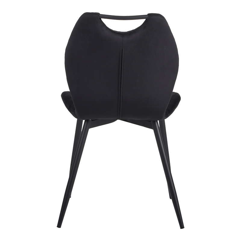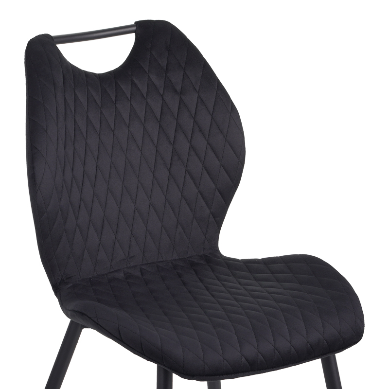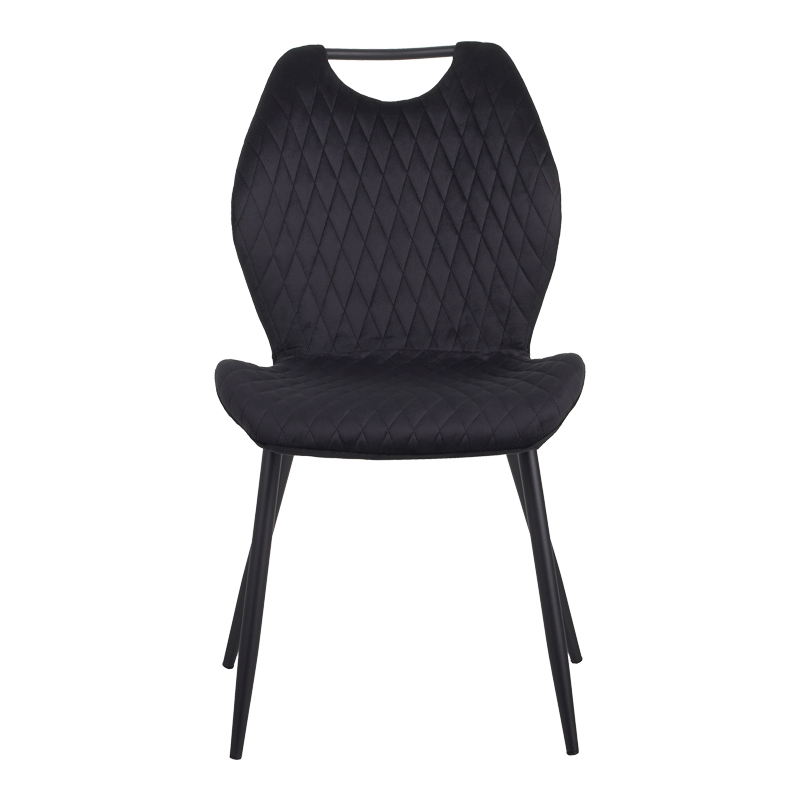 Καρέκλα Bongo pakoworld βελούδο σε μαύρη απόχρωση με μαύρα μεταλλικά πόδια 56.5x47x84εκ Η καρέκλα Bongo συνδυάζει τον μοντέρνο σχεδιασμό με την άνεση, προσφέροντας μια κομψή και λειτουργική προσθήκη σε κάθε τραπεζαρία. Με το μοναδικό της σχήμα και το καπιτονέ σχέδιο, η καρέκλα αυτή ξεχωρίζει για την αισθητική της και την άνεση που προσφέρει.Τεχνικά χαρακτηριστικά: Σταθερός μεταλλικός σκελετός από εξαιρετικής ποιότητας υλικά με μεγάλη αντοχή και ανθεκτικότητα. Στήριξη σε τέσσερα μαύρα ενισχυμένα πόδια, εξαιρετικής ποιότητας και με αντοχή στο βάρος και στο χρόνο. Επένδυση με βελούδο ασυναγώνιστης ποιότητας με αντοχή στη φθορά και στις τριβές. Προσφέρεται σε μαύρο χρώμα.Διαστάσεις προϊόντος: Μήκος: 56.5 εκ Πλάτος: 47 εκ Ύψος: 84 εκΠληροφορίες υλικών: Velvet – Βελούδο: Το βελούδο είναι ένα ύφασμα με κοντές, πυκνές ίνες, συνήθως από μετάξι, βαμβάκι ή συνθετικά υλικά. Έχει μια απαλή, λεία υφή και μια πλούσια, γυαλιστερή εμφάνιση. Χαρακτηρίζεται για την πυκνότητα του και την απαλότητά του. Μέταλλο: Το μέταλλο χρησιμοποιείται ευρέως στην κατασκευή επίπλων, προσφέροντας μια σειρά από πλεονεκτήματα σε σχέση με άλλα υλικά. Είναι εξαιρετικά ανθεκτικό σε φθορές, ιδανικό για έπιπλα που προορίζονται για καθημερινή χρήση σε ένα απαιτητικό περιβάλλον. Διατηρεί το σχήμα και τη δομή του άψογα, εξασφαλίζοντας σταθερότητα και μακροζωία στα έπιπλα. Εκτός από τις ιδιότητες που αναφέρθηκαν παραπάνω, το μέταλλο μπορεί να έχει και άλλα χαρακτηριστικά, όπως η αντιμικροβιακή δράση (χαλκός) ή υπεραγωγιμότητα (μολυβδένιο).Συντήρηση υλικών: Βελούδο: Χρησιμοποιείστε μία μαλακή βούρτσα, ή την ηλεκτρική σας σκούπα και το εξάρτημα με την μαλακή τρίχα και με απαλές κινήσεις καθαρίστε το βελούδο. Σε περίπτωση λεκέ σκουπίστε με ένα μαλακό πανί και χλιαρό νερό, αλλά τρίψτε πολύ απαλά το λεκέ χωρίς να ασκείτε πίεση γιατί θα ποτίσει ακόμα πιο βαθιά. Ξεπλύνετε καλά την περιοχή με καθαρό νερό και αφήστε το ύφασμα να στεγνώσει μακριά από τον ήλιο. Μέταλλο: Εάν πρόκειται για οποιοδήποτε μέταλλο εσωτερικού χώρου, ένα ξεσκόνισμα ή ένα καθάρισμα με υγρό πανί σε τακτά χρονικά διαστήματα είναι η ενδεδειγμένη επιλογή.Παρατηρήσεις: Το προϊόν παραδίδεται αμοντάριστο, σε εργοστασιακή συσκευασία και με αναλυτικό οδηγό συναρμολόγησης. Η χρωματική απόχρωση του προϊόντος ενδέχεται να διαφέρει ελαφρώς σε σχέση με την φωτογραφική απεικόνισή του στην οθόνη σας.