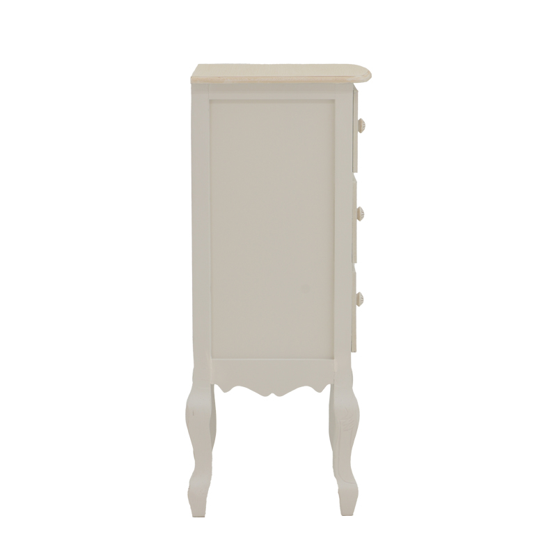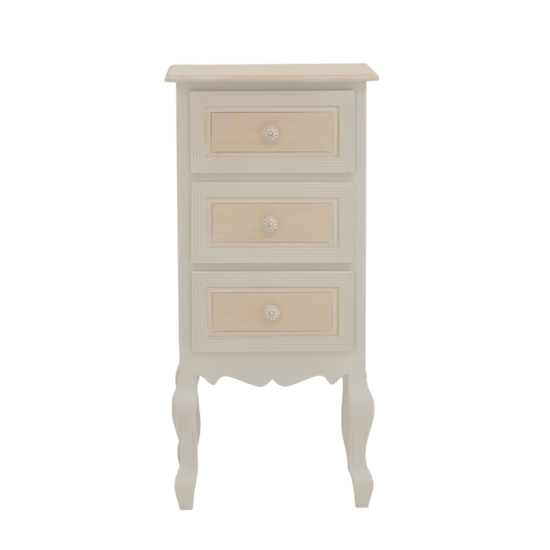 Κομοδίνο Joliene Inart mdf σε λευκή αντικέ-φυσική απόχρωση 40×34.5×82εκ Ψάχνετε μία συρταριέρα που θα τραβήξει τα βλέμματα; Η Joliene είναι εδώ για να σας καταπλήξει με τον vintage σχεδιασμό της και τον αέρα πολυτέλειας που αποπνέει. Συνδυάστε με τα υπόλοιπα έπιπλα της σειράς Joliene και δημιουργήστε φινετσάτες συνθέσεις στο χώρο σας!Τεχνικά χαρακτηριστικά: Σκελετός κατασκευασμένος από εξαιρετικής ποιότητας MDF. Προσφέρεται σε χρώμα αντικέ λευκό-φυσικό. Διαθέτει τρία συρτάρια για κλειστή αποθήκευση των αντικειμένων σας. Συνδυάζεται αρμονικά με τα υπόλοιπα προϊόντα της ίδιας σειράς.Διαστάσεις προϊόντος: Μήκος: 40 εκ. Πλάτος: 34.5 εκ. Ύψος: 82 εκ.Πληροφορίες υλικών: MDF (Medium-density fibreboard/ινοσανίδα): Το MDF (Medium-density fibreboard/ινοσανίδα) είναι παράγωγο ξύλου. Για την παραγωγή του χρησιμοποιούνται ρητίνες (κόλλες) για την συγκόληση των ινών ξύλου οι οποίες συμπιέζονται με ειδικές θερμαινόμενες πρέσες. Είναι πιο πυκνό από την μοριοσανίδα (chipboard) και ανθεκτικό σε αντοχή. Επίσης, δεν απορροφά καθόλου υγρασία.Οδηγίες συντήρησης: MDF: Για να το καθαρίσετε χρησιμοποιείστε ένα μαλακό στεγνό πανί ώστε να αφαιρέσετε σκόνη και βρωμιά. Για λεκέδες χρησιμοποιείστε ένα μαλακό πανί με χλιαρό νερό και ήπιο σαπούνι. Σκουπίστε απαλά την επιφάνεια μέχρι να αφαιρεθεί ο λεκές. Στο τέλος σκουπίστε καλά την επιφάνεια με ένα στεγνό πανί. Το MDF είναι ευαίσθητο στην υγρασία, επομένως είναι σημαντικό να το προστατεύετε από την υγρασία. Σκουπίστε τυχόν υγρά άμεσα. Μην χρησιμοποιείτε ισχυρά καθαριστικά ή χημικά, καθώς μπορεί να βλάψουν το MDF.Παρατηρήσεις: Το προϊόν παραδίδεται σε εργοστασιακή συσκευασία. Η χρωματική απόχρωση του προϊόντος ενδέχεται να διαφέρει ελαφρώς σε σχέση με την φωτογραφική απεικόνισή του στην οθόνη σας.