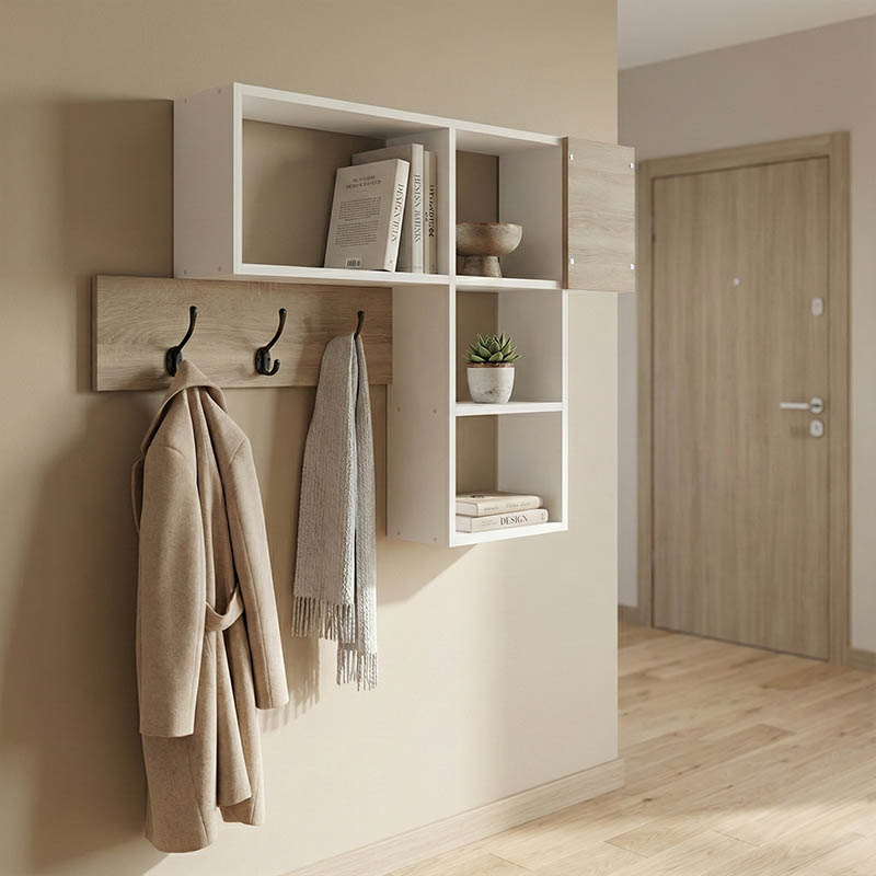 Κρεμάστρα τοίχου Wenia pakoworld σε sonoma-λευκό 99.5x15x61εκ Αξιοποιήστε στο έπακρο τον χώρο της εισόδου, του χωλ ή οποιουδήποτε δωματίου με αυτή την ευέλικτη και μοντέρνα σύνθεση τοίχου. Συνδυάζει την πρακτικότητα μιας κρεμάστρας με τον επιπλέον αποθηκευτικό χώρο των ραφιών.Τεχνικά χαρακτηριστικά: Σκελετός κατασκευασμένος από μοριοσανίδα με επένδυση μελαμίνης υψηλής ποιότητας, με αντοχή στην καταπόνηση, την φθορά και τον χρόνο. Περιλαμβάνει τρία στιβαρά μεταλλικά άγκιστρα σε μαύρο χρώμα που προσφέρουν άφθονο χώρο για να κρεμάσετε παλτό, κασκόλ, τσάντες ή κλειδιά. Φέρει διάφορες ανοιχτές θήκες/ράφια σε διαφορετικά μεγέθη και προσανατολισμούς, ιδανικές για την τοποθέτηση βιβλίων, μικρών διακοσμητικών, φυτών ή για την οργάνωση μικροαντικειμένων. Προσφέρεται σε χρώμα sonoma-λευκό.Διάσταση προϊόντος: Μήκος: 99.5 εκ. Πλάτος: 15 εκ. Ύψος: 61 εκ. Πληροφορίες υλικών: Μοριοσανίδα (Chipboard): Η μοριοσανίδα, γνωστή ως chipboard, είναι ένα σύνθετο ξύλινο υλικό που κατασκευάζεται από μικρά κομματάκια ξύλου, συνήθως πεύκου ή ελάτης, κολλημένα μαζί υπό υψηλή πίεση και θερμοκρασία με τη χρήση ρητινών. Χρησιμοποιείται ευρέως στην κατασκευή επίπλων, εσωτερικών επιφανειών και δομικών εφαρμογών. Κατασκευάζεται από ανακυκλωμένα υλικά και είναι ανθεκτική σε καμπύλες, τριβές και άλλες φυσικές καταπονήσεις. Μελαμίνη (LPB): Η μελαμίνη LPB (Low Pressure Melamine) είναι ένα συνθετικό υλικό που χρησιμοποιείται ευρέως στην επιφανειακή επεξεργασία μοριοσανίδας στην κατασκευή επίπλων και επιφανειών, λόγω της ανθεκτικότητάς της και της ευκολίας στη συντήρηση. Εφαρμόζεται σε υποστρώματα όπως το MDF (Medium-density fibreboard/ινοσανίδα) ή το κόντρα πλακέ OSB για να παράγει ανθεκτικές επιφάνειες. Οδηγίες συντήρησης: Μοριοσανίδα (Chipboard): Για τον καθαρισμό της μοριοσανίδας, μπορείτε να χρησιμοποιήσετε ένα μαλακό πανί ελαφρά εμποτισμένο με νερό και ήπιο απορρυπαντικό. Αποφύγετε την υπερβολική χρήση νερού και διατηρήστε την επιφάνεια στεγνή μετά τον καθαρισμό. Μελαμίνη (LPB): Για να αφαιρέσετε τους λεκέδες από την επιφάνεια χρησιμοποιείστε ένα μαλακό πανί με χλιαρό νερό και ήπιο σαπούνι. Σκουπίστε απαλά την επιφάνεια μέχρι να αφαιρεθεί ο λεκές. Η μελαμίνη είναι ευαίσθητη στην υγρασία, επομένως είναι σημαντικό να την προστατεύετε από το νερό.Παρατηρήσεις: Το προϊόν παραδίδεται αμοντάριστο σε εργοστασιακή συσκευασία με αναλυτικό οδηγό συναρμολόγησης. Η χρωματική απόχρωση του προϊόντος ενδέχεται να διαφέρει ελαφρώς σε σχέση με την φωτογραφική απεικόνισή του στην οθόνη σας.