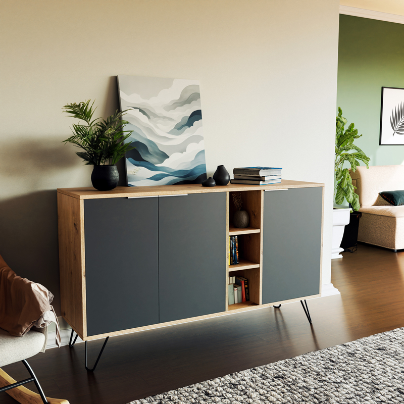 Μπουφές Clara pakoworld χρώμα light oak-ανθρακί 142×35.5×83εκ Μπουφές Clara pakoworld χρώμα light oak-ανθρακί 142×35.5×83εκΛατρεύεις τις λιτές φόρμες, τον κλασσικό σχεδιασμό και έπιπλα που μπορούν να δέσουν” άνετα σε οποιοδήποτε χώρο