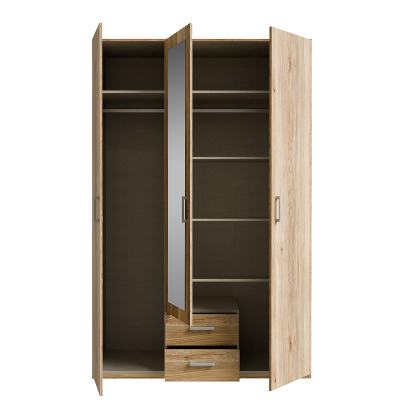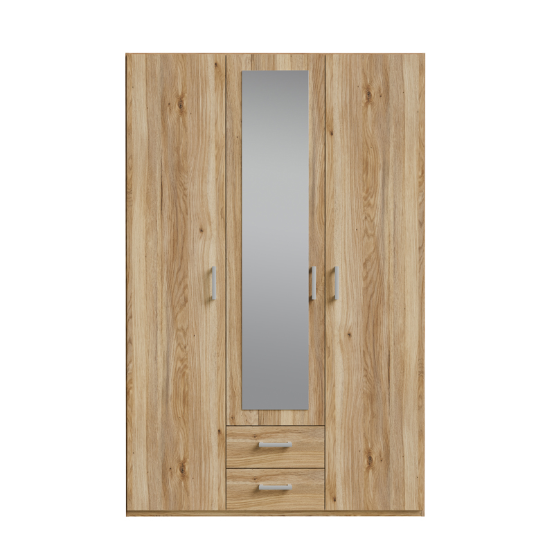 Ντουλάπα ανοιγόμενη τρίφυλλη με καθρέπτη Jakrine pakoworld μελαμίνη oak με 3 ράφια γκρι 133.2×54.2×210.5εκ Εάν ψάχνετε μια μεγάλη ντουλάπα για να τακτοποιήσετε όλα σας τα ρούχα και αξεσουάρ η ντουλάπα Jakrine είναι η ιδανική επιλογή. Κλασσική γραμμή και κατασκευή από ποιοτικά υλικά με μεγάλους χώρους αποθήκευσης που την καθιστούν αναγκαία και απαραίτητη για κάθε χώρο. Τεχνικά χαρακτηριστικά: Κατασκευασμένη από μοριοσανίδα επενδυμένη με μελαμίνη υψηλής ποιότητας, με αντοχή στην καταπόνηση και στον χρόνο. Προσφέρεται σε χρώμα oak. Περιλαμβάνει τρεις πόρτες, εσωτερικά φέρει ράγες για κρεμάστρες και κάτω δύο συρτάρια για την αποθήκευση ρούχων και αξεσουάρ. Τα πόμολα είναι κατασκευασμένα από εξαιρετικής ποιότητας pp.Τεχνικά χαρακτηριστικά ραφιών: Σετ 3 τεμαχίων. Κατασκευή από μοριοσανίδα με επένδυση μελαμίνης υψηλής ποιότητας, με αντοχή στην καταπόνηση, την φθορά και τον χρόνο. Προσφέρεται σε χρώμα γκρι.Διαστάσεις ντουλάπας: Μήκος: 133.2 εκ. Πλάτος: 54.2 εκ. Ύψος: 210.5 εκ. Βάρος αντοχής ράγας: 25 kg. Βάρος αντοχής συρταριού: 5 kg.Διαστάσεις ραφιών: Μήκος: 42.2 εκ. Πλάτος: 1.5 εκ. Ύψος: 42 εκ. Βάρος αντοχής ραφιών: 15 kg.Πληροφορίες υλικών: Μοριοσανίδα: Η μοριοσανίδα, γνωστή ως chipboard, είναι ένα σύνθετο ξύλινο υλικό που κατασκευάζεται από μικρά κομματάκια ξύλου, συνήθως πεύκου ή ελάτης, κολλημένα μαζί υπό υψηλή πίεση και θερμοκρασία με τη χρήση ρητινών. Χρησιμοποιείται ευρέως στην κατασκευή επίπλων, εσωτερικών επιφανειών και δομικών εφαρμογών. Κατασκευάζεται από ανακυκλωμένα υλικά και είναι ανθεκτική σε καμπύλες, τριβές και άλλες φυσικές καταπονήσεις. Μελαμίνη: Η μελαμίνη LPB (Low Pressure Melamine) είναι ένα συνθετικό υλικό που χρησιμοποιείται ευρέως στην επιφανειακή επεξεργασία μοριοσανίδας στην κατασκευή επίπλων και επιφανειών, λόγω της ανθεκτικότητάς της και της ευκολίας στη συντήρηση. Εφαρμόζεται σε υποστρώματα όπως το MDF (Medium-density fibreboard/ινοσανίδα) ή το κόντρα πλακέ OSB για να παράγει ανθεκτικές επιφάνειες.Οδηγίες συντήρησης: Μοριοσανίδα: Για τον καθαρισμό της μοριοσανίδας, μπορείτε να χρησιμοποιήσετε ένα μαλακό πανί ελαφρά εμποτισμένο με νερό και ήπιο απορρυπαντικό. Αποφύγετε την υπερβολική χρήση νερού και διατηρήστε την επιφάνεια στεγνή μετά τον καθαρισμό. Μελαμίνη: Ένα από τα πιο γνωστά υλικά στον χώρο του επίπλου είναι η μελαμίνη. Για να αφαιρέσετε τους λεκέδες από την επιφάνεια χρησιμοποιείστε ένα μαλακό πανί με χλιαρό νερό και ήπιο σαπούνι. Σκουπίστε απαλά την επιφάνεια μέχρι να αφαιρεθεί ο λεκές. Η μελαμίνη είναι ευαίσθητη στην υγρασία, επομένως είναι σημαντικό να την προστατεύετε από το νερό.Παρατηρήσεις: Το προϊόν παραδίδεται σε εργοστασιακή συσκευασία. Η χρωματική απόχρωση του προϊόντος ενδέχεται να διαφέρει ελαφρώς σε σχέση με την φωτογραφική απεικόνισή του στην οθόνη σας.