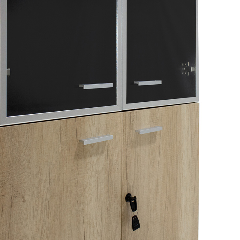 Ντουλάπα γραφείου με γυάλινες πόρτες Lotus pakoworld χρώμα φυσικό – ανθρακί 80x40x1εκ Ντουλάπα γραφείου με γυάλινες πόρτες Lotus χρώμα φυσικό – ανθρακί 80x40x1εκ Για εσάς που αναζητάτε μία ντουλάπα με χώρους αποθήκευσης που να μπορεί να κλειδώνει για το γραφείο, η σειρά Lotus είναι η καλύτερη επαγγελματική λύση. Πρακτική και με κλασικό σχεδιασμό θα ανανεώσει αισθητά την εικόνα της επιχείρησης σας, καλύπτοντας παράλληλα όλες τις λειτουργικές σας ανάγκεςΝτουλάπα Lotus στον εντυπωσιακό χρωματικό συνδυασμό: Φυσικό – ανθρακί. Κατασκευασμένη από υλικά υψηλών προδιαγραφών και σύμφωνα με τις εργονομικές απαιτήσεις του σήμερα. Τεχνικά χαρακτηριστικά: Επιφάνεια (καπάκι και ράφια) κατασκευασμένα από μοριοσανίδα με επένδυση μελαμίνης υψηλής ποιότητας. Τα πλαϊνά μέρη και οι πόρτες φέρουν μελαμίνη 20 χιλ, προσφέρεται στον χρωματισμό του φυσικού – ανθρακί. Στο πάνω μέρος φέρει γυάλινες πόρτες με περιμετρικό προστατευτικό πλαίσιο αλουμινίου. Φέρει κλειδαριές που ασφαλίζει τα ντουπάπια κάτω για την καλύτερη δυνατή προστασία του περιεχομένου τους. Συνδυάζεται αρμονικά με τα υπόλοιπα είδη της σειράς: Βιβλιοθήκες, ντουλάπια, γραφεία και τραπεζάκι επισκέπτη.Διάσταση προϊόντος: Μήκος: 80 εκ. Πλάτος: 40 εκ. Ύψος: 1 εκ.Πληροφορίες υλικών: Μοριοσανίδα (Chipboard): Η μοριοσανίδα, γνωστή ως chipboard, είναι ένα σύνθετο ξύλινο υλικό που κατασκευάζεται από μικρά κομματάκια ξύλου, συνήθως πεύκου ή ελάτης, κολλημένα μαζί υπό υψηλή πίεση και θερμοκρασία με τη χρήση ρητινών. Χρησιμοποιείται ευρέως στην κατασκευή επίπλων, εσωτερικών επιφανειών και δομικών εφαρμογών. Κατασκευάζεται από ανακυκλωμένα υλικά και είναι ανθεκτική σε καμπύλες, τριβές και άλλες φυσικές καταπονήσεις. Μελαμίνη (LPB):Η μελαμίνη LPB (Low Pressure Melamine) είναι ένα συνθετικό υλικό που χρησιμοποιείται ευρέως στην επιφανειακή επεξεργασία μοριοσανίδας στην κατασκευή επίπλων και επιφανειών, λόγω της ανθεκτικότητάς της και της ευκολίας στη συντήρηση. Εφαρμόζεται σε υποστρώματα όπως το MDF (Medium-density fibreboard/ινοσανίδα) ή το κόντρα πλακέ OSB για να παράγει ανθεκτικές επιφάνειες. Οδηγίες συντήρησης: Μοριοσανίδα (Chipboard): Για τον καθαρισμό της μοριοσανίδας, μπορείτε να χρησιμοποιήσετε ένα μαλακό πανί ελαφρά εμποτισμένο με νερό και ήπιο απορρυπαντικό. Αποφύγετε την υπερβολική χρήση νερού και διατηρήστε την επιφάνεια στεγνή μετά τον καθαρισμό Μελαμίνη (LPB): Για να αφαιρέσετε τους λεκέδες από την επιφάνεια χρησιμοποιείστε ένα μαλακό πανί με χλιαρό νερό και ήπιο σαπούνι. Σκουπίστε απαλά την επιφάνεια μέχρι να αφαιρεθεί ο λεκές. Η μελαμίνη είναι ευαίσθητη στην υγρασία, επομένως είναι σημαντικό να την προστατεύετε από το νερό.Παρατηρήσεις: Το προϊόν παραδίδεται σε εργοστασιακή συσκευασία και με αναλυτικό οδηγό συναρμολόγησης. Η χρωματική απόχρωση του προϊόντος ενδέχεται να διαφέρει ελαφρώς σε σχέση με την φωτογραφική απεικόνισή του στην οθόνη σας.