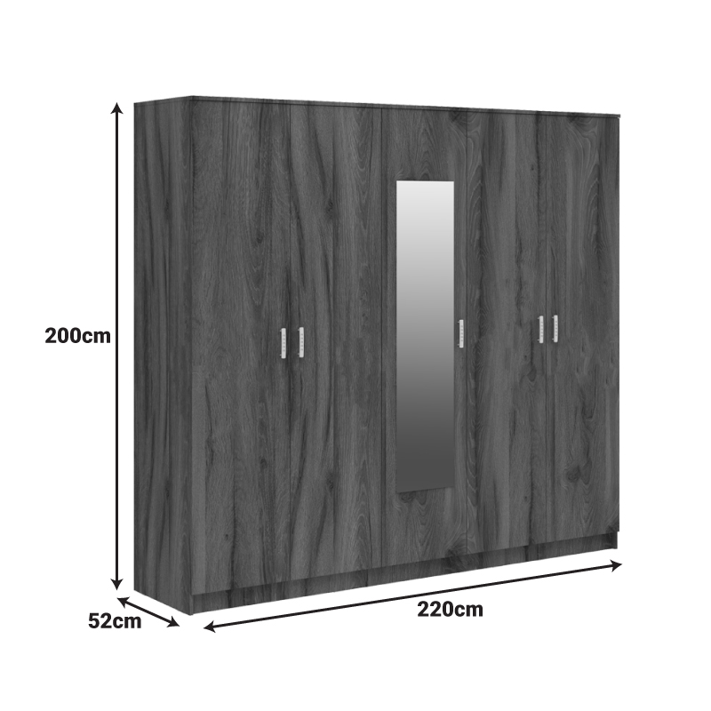 Ντουλάπα πεντάφυλλη με καθρέφτη Luna pakoworld καρυδί-oak 220x52x200εκ Εάν ψάχνετε μια μεγάλη ντουλάπα για να οργανώσετε και να τακτοποιήσετε όλα σας τα ρούχα και αξεσουάρ η ντουλάπα Luna είναι η ιδανική επιλογή. Κλασσική γραμμή με καθρέπτη και πολλαπλούς χώρους αποθήκευσης την καθιστούν απαραίτητη για κάθε χώρο. Τεχνικά χαρακτηριστικά: Κατασκευασμένη από υψηλής ποιότητας μοριοσανίδα με επενδυση μελαμίνης , με αντοχή στην καταπόνηση και στον χρόνο. Προσφέρεται σε χρώμα καρυδί-oak με υπέροχα νερά που απογειώνει το αισθητικό αποτέλεσμα. Με πέντε ανοιγόμενα φύλλα και ενσωματωμένο καθρέπτη. Στο εσωτερικό περιλαμβάνει δύο μεταλλικες βέργες για κρεμάστρες και ράφια στη μέση για την καλύτερη δυνατή αξιοποίηση του χώρου Διαστάσεις προϊόντος: Μήκος: 220 εκ. Πλάτος: 52 εκ. Ύψος: 200 εκ.Παρατηρήσεις: Το προϊόν παραδίδεται αμοντάριστο, σε εργοστασιακή συσκευασία και με αναλυτικό οδηγό συναρμολόγησης. Η χρωματική απόχρωση του προϊόντος ενδέχεται να διαφέρει ελαφρώς σε σχέση με την φωτογραφική απεικόνισή του στην οθόνη σας.