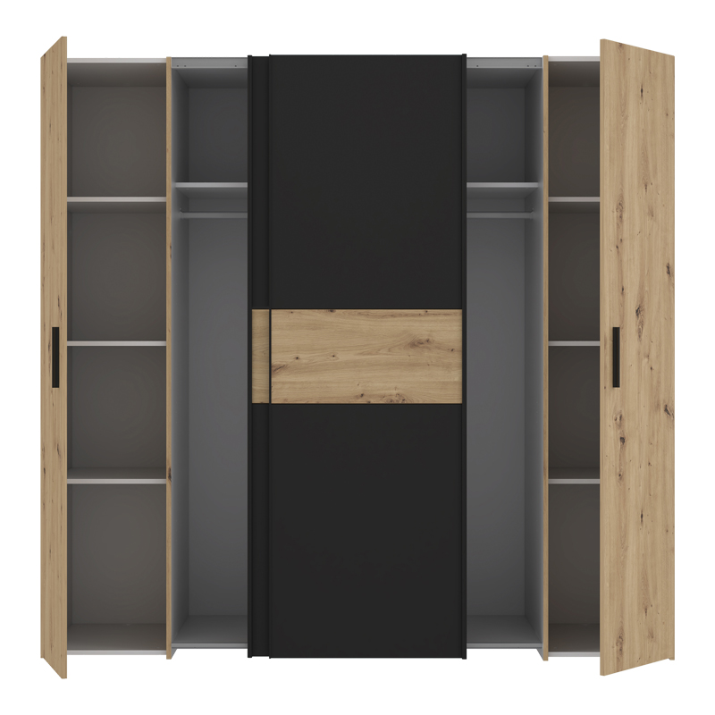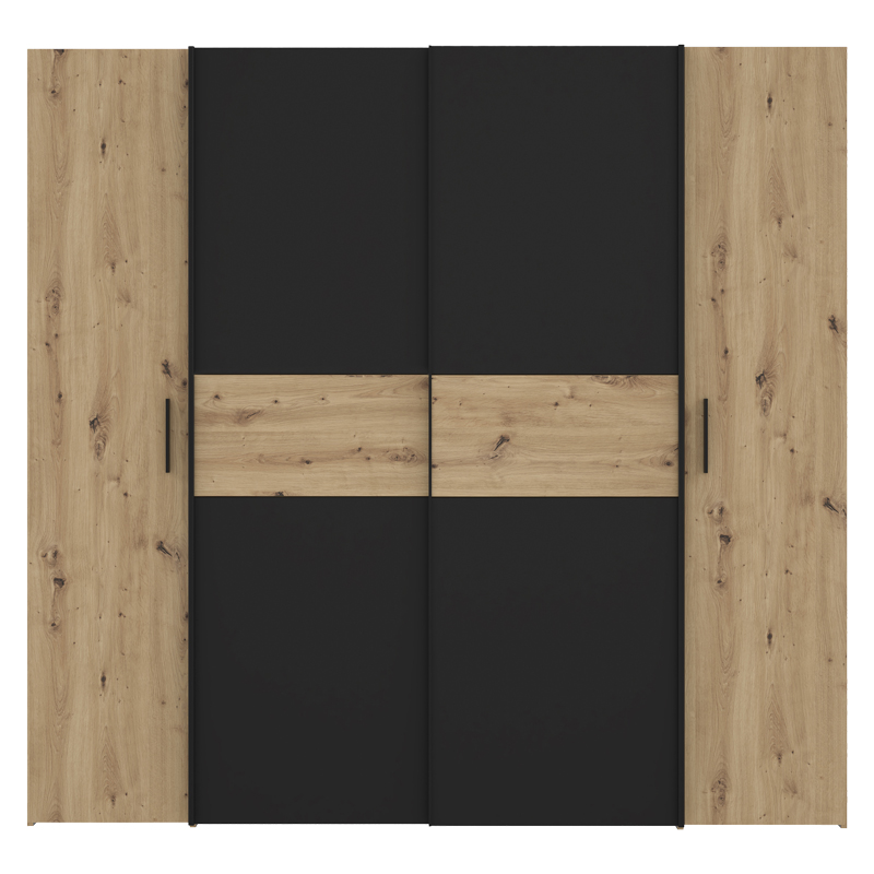 Ντουλάπα ρούχων Bekerk pakoworld τετράφυλλη μαύρο-oak μελαμίνης 200×61.5×190.5εκ Ντουλάπα ρούχων Bekerk pakoworld τετράφυλλη μαύρο-oak μελαμίνης 200×61.5×190.5εκΕιδικά για εσένα:*Που θέλεις να αξιοποιήσεις κάθε πιθαμή του λιγοστού σου χώρου.*Που αναζητάς επιπλέον χώρο αποθήκευσης για να οργανώσεις ρούχα και αξεσουάρ με τον καλύτερο δυνατό τρόπο.Τεχνικά χαρακτηριστικά:* Σκελετός κατασκευασμένος από μοριοσανίδα με επένδυση μελαμίνης υψηλής ποιότητας, με αντοχή στην καταπόνηση, την φθορά και τον χρόνο. Η μοριοσανίδα είναι γνωστή για την αντοχή της σε φορτία και πίεση. Αυτή η ιδιότητα την καθιστά κατάλληλη για την κατασκευή επίπλων όπως οι ντουλάπες.* Προσφέρεται σε χρώμα μαύρο-oak.* Περιλαμβάνει τέσσερις μεγάλες πόρτες (οι δύο είναι ανοιγόμενες και οι δύο είναι συρόμενες)Διάσταση προϊόντος:Μήκος: 200 εκ.Βάθος: 61.5 εκ.Ύψος: 190.5 εκ.Παρατηρήσεις:Το προϊόν παραδίδεται αμοντάριστο, σε εργοστασιακή συσκευασία και με αναλυτικό οδηγό συναρμολόγησης.Η χρωματική απόχρωση του προϊόντος ενδέχεται να διαφέρει ελαφρώς σε σχέση με την φωτογραφική απεικόνισή του στην οθόνη σας.