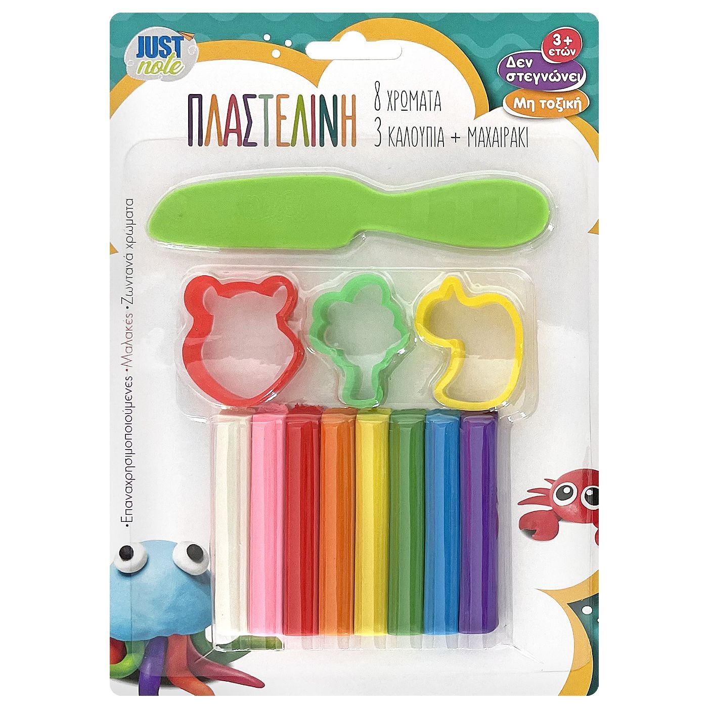 Πλαστελίνη & 3 Καλούπια σετ=8χρωμ. 100g net JustNote 70900 Σετ=8 χρώματα & 3 καλούπια & μαχαιράκι 100g net