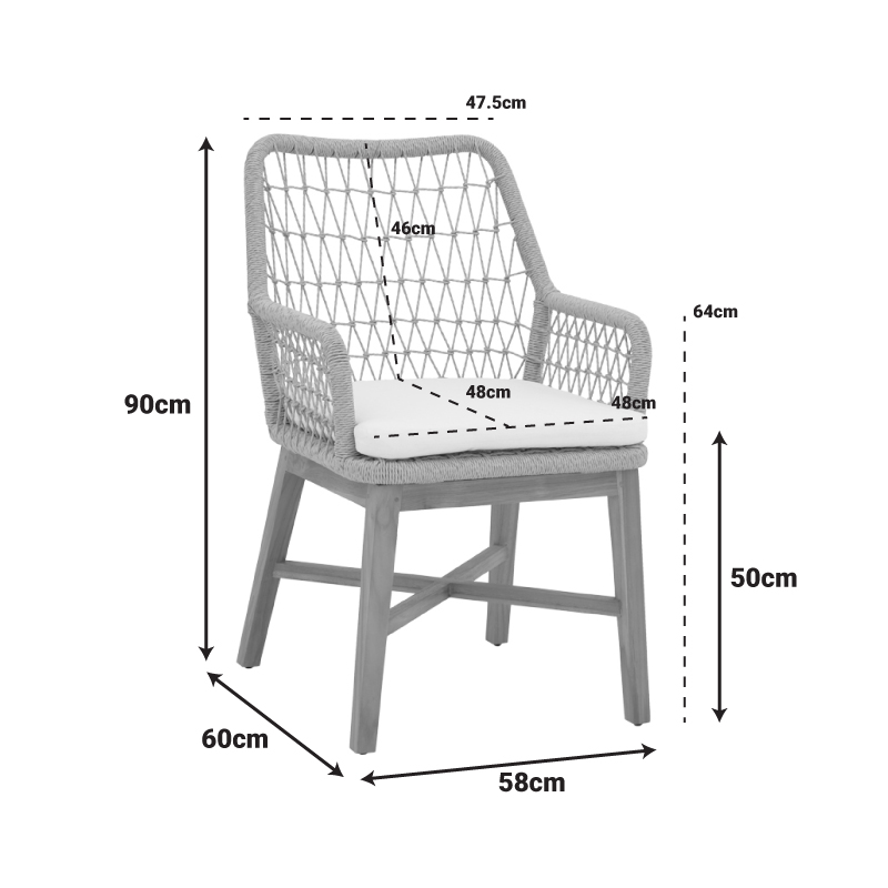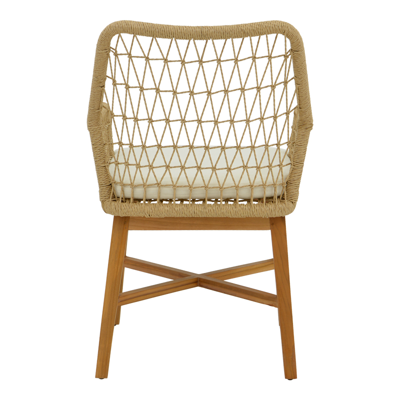 Πολυθρόνα Elaiza pakoworl teak ξύλο και pe σχοινί σε φυσική-μπεζ απόχρωση με μαξιλάρι 58x60x90εκ Διακοσμήστε τον εσωτερικό χώρο του σπιτιού σας με την τελευταία τάση του σύγχρονου design! Η πολυθρόνα Elaiza σας προσφέρει ανθεκτικότητα χάρη στην εξαιρετική ποιότητα κατασκευής της. Απολαύστε την και συνδυάστε την αισθητική με την εργονομία.Τεχνικά χαρακτηριστικά: Κατασκευή από teak ξύλο εξαιρετικής ποιότητας και ανθεκτικότητας. Επένδυση με συνθετικό σχοινί μεγάλης αντοχής. Περιλαμβάνει και αναπαυτικό μαξιλάρι για το κάθισμα. Προσφέρεται σε χρώμα φυσικό-μπεζ .Διαστάσεις προϊόντος: Μήκος: 58 εκ. Πλάτος: 60 εκ. Ύψος: 90 εκ. Μήκος καθίσματος: 48 εκ Πλάτος καθίσματος: 48 εκ Υψος καθίσματος: 50 εκ Μήκος πλάτης: 47.5 εκ Υψος πλάτης: 46 εκ Υψος μπράτσου απο το έδαφος: 64 εκΠληροφορίες υλικών: Teakwood: Είναι ένα είδος ξύλου που προέρχεται από το δέντρο Tectona grandis. Είναι γνωστό για την υψηλή του αντοχή και ανθεκτικότητα στη διάβρωση και την υγρασία. Επιπλέον, έχει φυσικά χαρακτηριστικά νερά και χρώματα που το καθιστούν πολύ ελκυστικό. Η χρωματική του απόχρωση μπορεί να ποικίλει από χρυσαφί έως καφέ με γκρι τόνους. Σχοινί: Το συνθετικό σχοινί είναι ένα είδος σχοινιού που κατασκευάζεται από ανθρωπογενείς ίνες, αντί για φυσικές ίνες όπως το βαμβάκι ή το μαλλί. Οι πιο κοινές συνθετικές ίνες που χρησιμοποιούνται στα συνθετικά σχοινιά είναι το νάιλον, ο πολυεστέρας και το πολυπροπυλένιο. Ύφασμα: Το ύφασμα είναι ένα ευέλικτο υλικό που κατασκευάζεται από την ύφανση, πλέξιμο, βελονιά ή συγκόλληση ινών. Αυτές οι ίνες μπορεί να είναι φυσικές, όπως βαμβάκι, μαλλί ή μετάξι, ή συνθετικές, όπως πολυεστέρας ή νάιλον. Η ύφανση των ινών δημιουργεί ένα δίκτυο που δίνει στο ύφασμα τις ιδιότητές του, όπως η αντοχή, η απαλότητα, η διαπνοή και η ελαστικότητα. Υπάρχουν άπειρες ποικιλίες υφασμάτων, καθεμιά με τα δικά της μοναδικά χαρακτηριστικά και χρήσεις.Οδηγίες συντήρησης: Teakwood: ια τον καθαρισμό του teakwood, χρησιμοποιήστε ένα μαλακό πανί ελαφρά εμποτισμένο με νερό και ήπιο σαπούνι. Ξεπλύνετε καλά και στεγνώστε με ένα καθαρό πανί. Σχοινί: Η καθαριότητα και η συντήρηση του σχοινιού εξαρτάται από το υλικό από το οποίο κατασκευάζεται. Γενικά, τα σχοινιά πλένονται με ζεστό νερό και ήπιο απορρυπαντικό. Τα σχοινιά από συνθετικές ίνες είναι ανθεκτικά στην υγρασία και συνήθως δεν απαιτούν ειδική συντήρηση. Ύφασμα: Η συντήρηση του υφάσματος εξαρτάται από διάφορους παράγοντες, όπως το είδος της ίνας, η κατασκευή του υφάσματος και η χρήση του. Χρησιμοποιήστε ένα ήπιο απορρυπαντικό που είναι κατάλληλο για τον τύπο του υφάσματος. Αποφύγετε τη χρήση χλωρίνης ή λευκαντικών, καθώς μπορεί να βλάψουν τις ίνες.Παρατηρήσεις: Το προϊόν παραδίδεται σε εργοστασιακή συσκευασία . Η χρωματική απόχρωση του προϊόντος ενδέχεται να διαφέρει ελαφρώς σε σχέση με την φωτογραφική απεικόνισή του στην οθόνη σας.