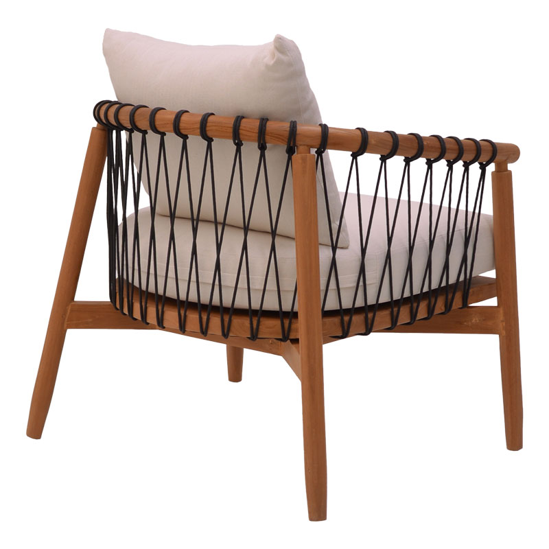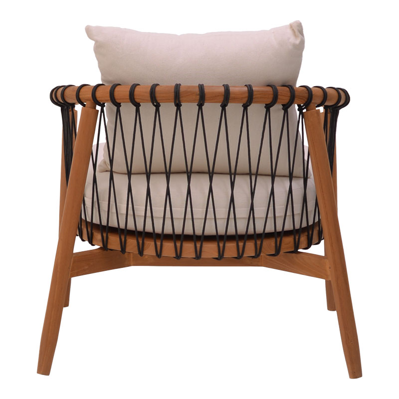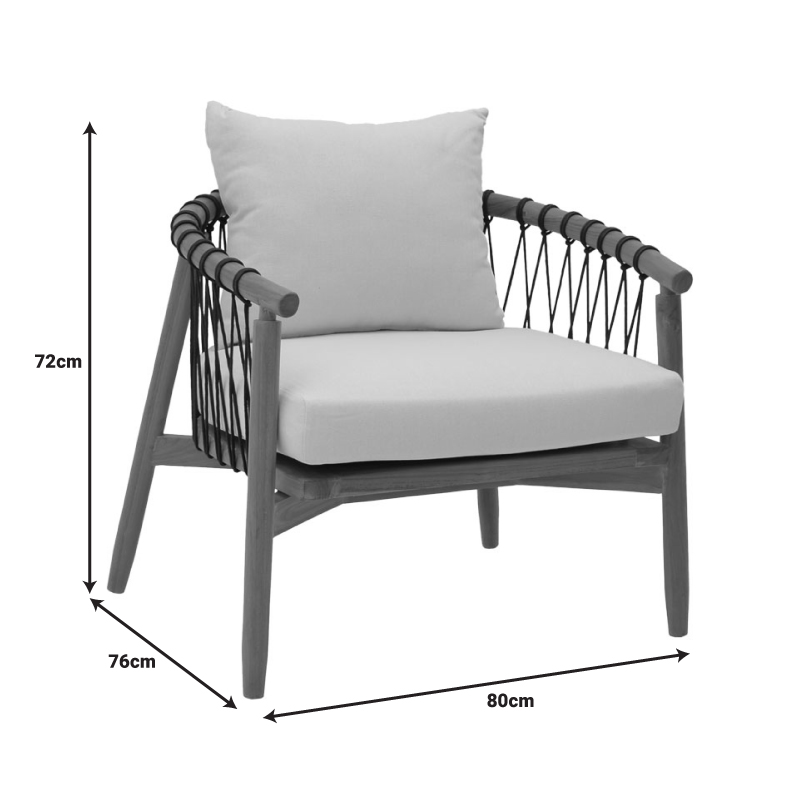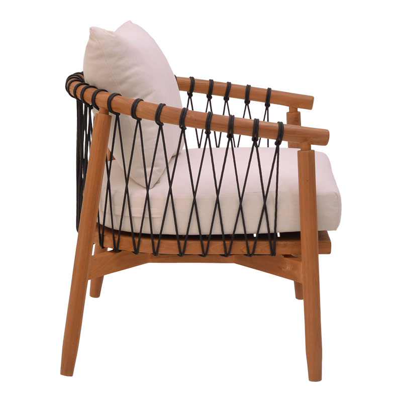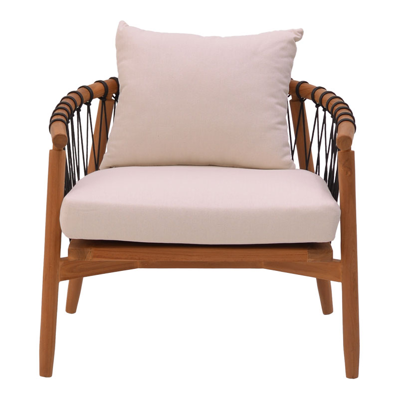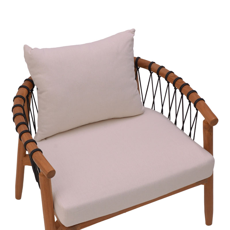 Πολυθρόνα Haribo pakoworld φυσικό teak ξύλο-μαύρο σχοινί-λευκο μαξιλάρι 80x76x72εκ Αν ψάχνετε μία πολυθρόνα της οποίας ο σχεδιασμός να συνδυάζει άρτια αισθητικά το κλασσικό με το μοντέρνο τότε η Haribo είναι η ιδανική για εσάς. Λιτή και παράλληλα κομψή μπορεί να κοσμήσει υπέροχα χώρο σας!Τεχνικά χαρακτηριστικά: Ενισχυμένος ξύλινος σκελετός με μεγάλη ανθεκτικότητα και αντοχές στη φθορά. Πλάτη και έδρα κατασκευασμένες από teak ξύλο. Η πλάτη περικλείεται από ανθεκτικό σχοινί. Διαθέτει μαξιλάρι σε λευκή απόχρωση για ακόμη πιο άνετο κάθισμα. Προσφέρεται σε φυσικό-μαύρο χρώμα. Διαστάσεις προϊόντος: Μήκος: 80 εκ. Πλάτος: 76 εκ. Ύψος: 72 εκ.Πληροφορίες υλικών: Teak ξύλο: Είναι ένα είδος ξύλου που προέρχεται από το δέντρο Tectona grandis. Είναι γνωστό για την υψηλή του αντοχή και ανθεκτικότητα στη διάβρωση και την υγρασία. Επιπλέον, έχει φυσικά χαρακτηριστικά νερά και χρώματα που το καθιστούν πολύ ελκυστικό. Η χρωματική του απόχρωση μπορεί να ποικίλει από χρυσαφί έως καφέ με γκρι τόνους. Σχοινί: Το Rope (σχοινί) αναφέρεται σε μια συλλογή ινών που πλέκονται μαζί για να δημιουργήσουν ένα εύκαμπτο, αλλά δυνατό και ανθεκτικό υλικό. Τα σχοινιά κατασκευάζονται από διάφορα υλικά, συμπεριλαμβανομένων των φυσικών ινών όπως βαμβάκι, λινάρι.Οδηγίες συντήρησης: Teak ξύλο: Για τον καθαρισμό του teakwood, χρησιμοποιήστε ένα μαλακό πανί ελαφρά εμποτισμένο με νερό και ήπιο σαπούνι. Ξεπλύνετε καλά και στεγνώστε με ένα καθαρό πανί. Σχοινί: Η καθαριότητα και η συντήρηση του σχοινιού εξαρτάται από το υλικό από το οποίο κατασκευάζεται. Γενικά, τα σχοινιά πλένονται με ζεστό νερό και ήπιο απορρυπαντικό. Τα σχοινιά από συνθετικές ίνες είναι ανθεκτικά στην υγρασία και συνήθως δεν απαιτούν ειδική συντήρηση.Παρατηρήσεις: Το προϊόν παραδίδεται σε εργοστασιακή συσκευασία Η χρωματική απόχρωση του προϊόντος ενδέχεται να διαφέρει ελαφρώς σε σχέση με την φωτογραφική απεικόνιση του στην οθόνη σας.
