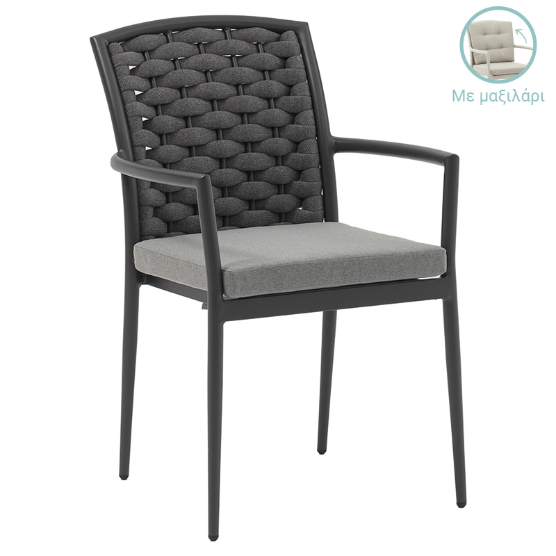 Πολυθρόνα Moritz pakoworld αλουμίνιο ανθρακί σχοινί-μαξιλάρι γκρι Πολυθρόνα κήπου Moritz pakoworld αλουμίνιο ανθρακί σχοινί-μαξιλάρι γκριΑν ψάχνετε μία πολυθρόνα κήπου της οποίας ο σχεδιασμός να συνδυάζει άρτια αισθητικά το κλασσικό με το μοντέρνο τότε η Moritz είναι η ιδανική για εσάς. Λιτή και παράλληλα κομψή μπορεί να κοσμήσει υπέροχα τον κήπο ή το μπαλκόνι σας!Τεχνικά χαρακτηριστικά:Σταθερός σκελετός από εξαιρετικής ποιότητας αλουμίνιο (28xT1.5mm)με αντοχή στην καταπόνηση και στη φθορά.Η πλάτη είναι κατασκευασμένη από textilene σχοινί, ανθεκτικό στις ακτινοβολίες UV. Περιλαμβάνει μαξιλάρι για την έδρα του καθίσματος με foam 5εκ, την πλάτη το καθίσματος με foam 3εκ, αφαιρούμενο κάλυμμα και ύφασμα polyester. Κατάλληλο για χρήση σε εσωτερικούς ή στεγασμένους εξωτερικούς χώρους. Στοιβάζεται χωρίς το μαξιλάριαλουμίνιο ανθρακί σχοινί-μαξιλάρι γκριΔιάσταση:Μήκος: 57 εκ.Πλάτος: 64 εκ.Ύψος: 87 εκ.Ύψος έδρας: 43,5 εκ.Βάθος έδρας: 46 εκ.Ύψος πλάτης: 48 εκ.Παρατηρήσεις:Το προϊόν παραδίδεται μονταρισμένο σε εργοστασιακή συσκευασία.Η χρωματική απόχρωση του προϊόντος ενδέχεται να διαφέρει ελαφρώς σε σχέση με την φωτογραφική απεικόνισή του στην οθόνη σας