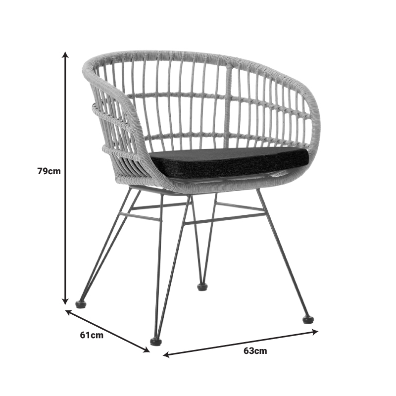 Πολυθρόνα Naoki pakoworld με μαξιλάρι pe rattan σε φυσική απόχρωση και μαύρα μεταλλικά πόδια 63x61x79εκ Για εσάς που αναζητάτε μία πολυθρόνα για τον κήπο, το μπαλκόνι ή τον επαγγελματικό σας χώρο, η πολυθρόνα Naoki είναι η καλύτερη πρόταση της αγοράς. Ο ιδανικός συνδυασμός ποιότητας και άνεσης την μετατρέπουν σε απαραίτητο αξεσουάρ για κάθε χώρο. Τεχνικά χαρακτηριστικά: Κατασκευή από εξαιρετικής ποιότητας pe rattan φυσικού χρώματος. Στήριξη σε μεταλλικό σκελετό σε μαύρο χρώμα που προσφέρει αντοχή στον χρόνο και τη φθορά. Διαθέτει υφασμάτινο μαξιλάρι 5εκ για την έδρα του καθίσματος για ένα άνετο κάθισμα. Προσφέρεται στον χρωματικό συνδυασμό μαύρο-φυσικό.Διαστάσεις προϊόντος: Μήκος: 63 εκ. Πλάτος: 61 εκ. Ύψος: 79 εκ. Ύψος καθίσματος: 45εκΠληροφορίες υλικών: PE Rattan: Είναι ένα δημοφιλές υλικό, απομίμηση φυσικού rattan, που χρησιμοποιείται στην κατασκευή επίπλων και αξεσουάρ. Κατασκευάζεται από πολυαιθυλένιο (polyethylene), το οποίο είναι μια ανθεκτική συνθετική πολυμερής ρητίνη. Είναι ανθεκτικό στις καιρικές συνθήκες, δεν φθείρεται από τον ήλιο ή τη βροχή και δεν ξεθωριάζει, ενώ παράλληλα είναι φιλικό προς το περιβάλλον. Μέταλλο: Το μέταλλο χρησιμοποιείται ευρέως στην κατασκευή επίπλων, προσφέροντας μια σειρά από πλεονεκτήματα σε σχέση με άλλα υλικά. Είναι εξαιρετικά ανθεκτικό σε φθορές, ιδανικό για έπιπλα που προορίζονται για καθημερινή χρήση σε ένα απαιτητικό περιβάλλον. Διατηρεί το σχήμα και τη δομή του άψογα, εξασφαλίζοντας σταθερότητα και μακροζωία στα έπιπλα. Εκτός από τις ιδιότητες που αναφέρθηκαν παραπάνω, το μέταλλο μπορεί να έχει και άλλα χαρακτηριστικά, όπως η αντιμικροβιακή δράση (χαλκός) ή υπεραγωγιμότητα (μολυβδένιο). Ύφασμα: Το ύφασμα είναι ένα ευέλικτο υλικό που κατασκευάζεται από την ύφανση, πλέξιμο, βελονιά ή συγκόλληση ινών. Αυτές οι ίνες μπορεί να είναι φυσικές, όπως βαμβάκι, μαλλί ή μετάξι, ή συνθετικές, όπως πολυεστέρας ή νάιλον. Η ύφανση των ινών δημιουργεί ένα δίκτυο που δίνει στο ύφασμα τις ιδιότητές του, όπως η αντοχή, η απαλότητα, η διαπνοή και η ελαστικότητα. Υπάρχουν άπειρες ποικιλίες υφασμάτων, καθεμιά με τα δικά της μοναδικά χαρακτηριστικά και χρήσεις.Οδηγίες συντήρησης: PE Rattan: Είναι εύκολο στη συντήρηση και τον καθαρισμό, απαιτεί απλό πλύσιμο με νερό και σαπούνι. Μέταλλο: Εάν πρόκειται για μεταλλικά έπιπλα εξωτερικού χώρου, θα πρέπει να ακολουθήσετε τα παρακάτω βήματα: Για μεγαλύτερη διάρκεια προστασίας, περάστε τα μεταλλικά σας έπιπλα με προστατευτική κρέμα που μπορείτε να προμηθευτείτε εύκολα από εμπορικά καταστήματα. Εάν τα έπιπλά σας είναι επεξεργασμένα και βαμμένα με την μέθοδο του powder-coating (ηλεκτροστατική βαφή) τότε είναι πολύ ανθεκτικά και καθαρίζονται εύκολα με ένα υγρό πανί. Εάν τα μεταλλικά σας έπιπλα δεν έχουν ηλεκτροστατική βαφή, τότε θα πρέπει να τα προσέχετε περισσότερο και να τα κρατάτε μακριά από νερά και υγρασία. Μπορείτε να τα καλύψετε με ειδικά καλύμματα και τον χειμώνα να τα βάζετε εάν μπορείτε σε εσωτερικό χώρο. Εάν παρατηρήσετε σκουριά, τότε αφαιρέστε την με νέφτι και στην συνέχεια περάστε αντισκωριακό βερνίκι πριν βάψετε την επιφάνεια με μπογιά, ανθεκτική στην οξείδωση. Ύφασμα: Η συντήρηση του υφάσματος εξαρτάται από διάφορους παράγοντες, όπως το είδος της ίνας, η κατασκευή του υφάσματος και η χρήση του. Χρησιμοποιήστε ένα ήπιο απορρυπαντικό που είναι κατάλληλο για τον τύπο του υφάσματος. Αποφύγετε τη χρήση χλω