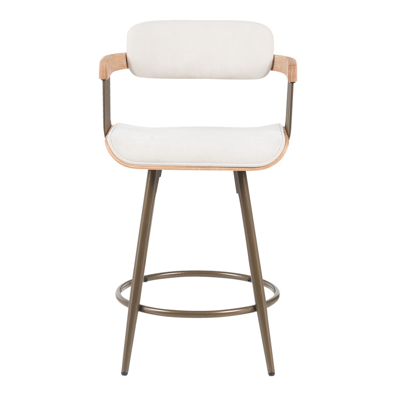 Σκαμπό μπαρ Cameo pakoworld περιστρεφόμενο μέταλλο μπρονζέ-white-wash ξύλο-μπέζ ύφασμα 53x50x93εκ Το σκαμπό μπαρ Cameo συνδυάζει αρμονικά τη σύγχρονη αισθητική με την άνεση. Διαθέτει ένα καμπυλωτό κάθισμα και πλάτη, επενδυμένα με ένα απαλό ύφασμα που προσφέρει εξαιρετική άνεση . Οι λεπτομέρειες από φυσικό ξύλο στα μπράτσα προσθέτουν μια ζεστή, οργανική αίσθηση, ενώ τα μεταλλικά πόδια ολοκληρώνουν την εκλεπτυσμένη εμφάνιση, προσδίδοντας σταθερότητα αλλά και μια αίσθηση ελαφρότητας.Τεχνικά χαρακτηριστικά: Λεπτομέρεις από plywood σε white wash χρώμα με μεγάλη ανθεκτικότητα και αντοχές στη φθορά. Έχει μοντέρνο καμπύλο σχεδιασμό για άνεση Στήριξη σε μεταλλικά πόδια σε μπρονζέ απόχρωση Επένδυση με ύφασμα ασυναγώνιστης ποιότητας με αντοχή στη φθορά και στις τριβές. Προσφέρεται σε χρώμα μπεζ. Προσφέρει δυνατότητα περιστροφής 360 μοιρών που σας επιτρέπει να περιστρέφετε την καρέκλα προς οποιαδήποτε κατεύθυνση χωρίς να καταπονείτε την πλάτη σας.Διάσταση προϊόντος: Μήκος: 53 εκ. Πλάτος: 50 εκ. Ύψος: 93 εκ.Παρατηρήσεις: Το προϊόν παραδίδεται σε εργοστασιακή συσκευασία και με αναλυτικό οδηγό συναρμολόγησης. Η χρωματική απόχρωση του προϊόντος ενδέχεται να διαφέρει ελαφρώς σε σχέση με την φωτογραφική απεικόνισή του στην οθόνη σας.