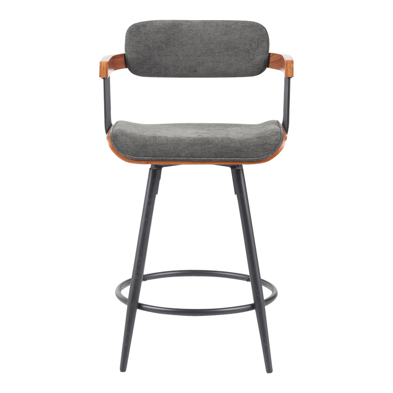 Σκαμπό μπαρ Cameo pakoworld περιστρεφόμενο μέταλλο μαύρο-καρυδί ξύλο-ανθρακί ύφασμα 53x50x93εκ Το σκαμπό μπαρ Cameo συνδυάζει αρμονικά τη σύγχρονη αισθητική με την άνεση. Διαθέτει ένα καμπυλωτό κάθισμα και πλάτη, επενδυμένα με ένα απαλό ύφασμα που προσφέρει εξαιρετική άνεση . Οι λεπτομέρειες από φυσικό ξύλο στα μπράτσα προσθέτουν μια ζεστή, οργανική αίσθηση, ενώ τα μεταλλικά πόδια ολοκληρώνουν την εκλεπτυσμένη εμφάνιση, προσδίδοντας σταθερότητα αλλά και μια αίσθηση ελαφρότητας.Τεχνικά χαρακτηριστικά: Λεπτομέρεις από plywood σε καρυδί χρώμα με μεγάλη ανθεκτικότητα και αντοχές στη φθορά. Έχει μοντέρνο καμπύλο σχεδιασμό για άνεση Στήριξη σε μεταλλικά πόδια σε μαύρη απόχρωση Επένδυση με ύφασμα ασυναγώνιστης ποιότητας με αντοχή στη φθορά και στις τριβές. Προσφέρει δυνατότητα περιστροφής 360 μοιρών που σας επιτρέπει να περιστρέφετε την καρέκλα προς οποιαδήποτε κατεύθυνση χωρίς να καταπονείτε την πλάτη σας. Προσφέρεται σε χρώμα ανθρακί.Διάσταση προϊόντος: Μήκος: 53 εκ. Πλάτος: 50 εκ. Ύψος: 93 εκ. Ύψος μέχρι το μπράτσο: 85εκ Παρατηρήσεις: Το προϊόν παραδίδεται σε εργοστασιακή συσκευασία και με αναλυτικό οδηγό συναρμολόγησης. Η χρωματική απόχρωση του προϊόντος ενδέχεται να διαφέρει ελαφρώς σε σχέση με την φωτογραφική απεικόνισή του στην οθόνη σας.