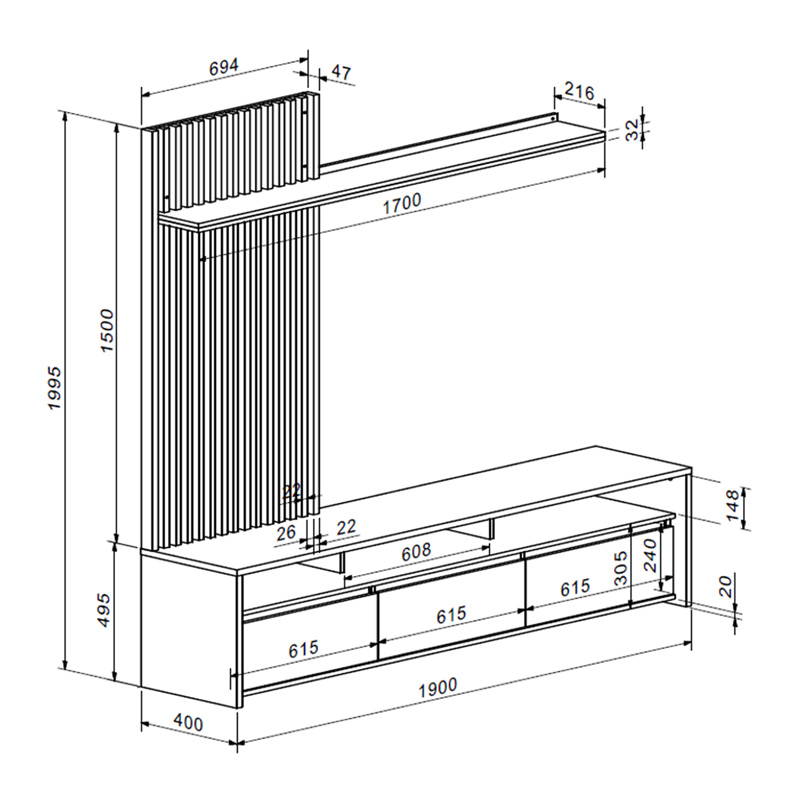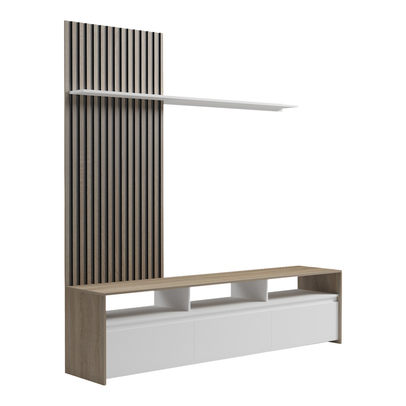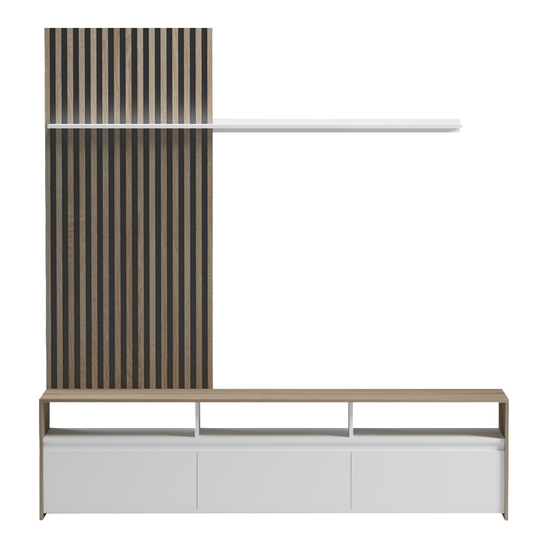 Σύνθετο σαλονιού Delfina pakoworld σε sonoma με λευκή απόχρωση 190x40x199.5εκ Δώστε μια σύγχρονη και καλαίσθητη πινελιά στο σαλόνι σας με αυτό το εντυπωσιακό έπιπλο τηλεόρασης! Ξεχωρίζει για τον μοντέρνο σχεδιασμό του και τον αμρονικό χρωματικό συνδυασμό.Τεχνικά χαρακτηριστικά: Κατασκευή από μοριοσανίδα με επένδυση μελαμίνης υψηλής ποιότητας, με αντοχή στην καταπόνηση, την φθορά και τον χρόνο. Προσφέρεται σε sonoma με λευκό χρώμα. Φέρει χώρο για κλειστή αποθήκευση καθώς και ράφια για την τοποθέτηση ηλεκτρικών συσκευών ή διακοσμητικών συνθέσεων.Διάσταση προϊόντος: Μήκος: 190 εκ. Πλάτος: 40 εκ. Ύψος: 199.5 εκ.Πληροφορίες υλικών: Μοριοσανίδα (Chipboard): Η μοριοσανίδα, γνωστή ως chipboard, είναι ένα σύνθετο ξύλινο υλικό που κατασκευάζεται από μικρά κομματάκια ξύλου, συνήθως πεύκου ή ελάτης, κολλημένα μαζί υπό υψηλή πίεση και θερμοκρασία με τη χρήση ρητινών. Χρησιμοποιείται ευρέως στην κατασκευή επίπλων, εσωτερικών επιφανειών και δομικών εφαρμογών. Κατασκευάζεται από ανακυκλωμένα υλικά και είναι ανθεκτική σε καμπύλες, τριβές και άλλες φυσικές καταπονήσεις. Μελαμίνη (LPB): Η μελαμίνη LPB (Low Pressure Melamine) είναι ένα συνθετικό υλικό που χρησιμοποιείται ευρέως στην επιφανειακή επεξεργασία μοριοσανίδας στην κατασκευή επίπλων και επιφανειών, λόγω της ανθεκτικότητάς της και της ευκολίας στη συντήρηση. Εφαρμόζεται σε υποστρώματα όπως το MDF (Medium-density fibreboard/ινοσανίδα) ή το κόντρα πλακέ OSB για να παράγει ανθεκτικές επιφάνειες.Οδηγίες συντήρησης: Μοριοσανίδα (Chipboard): Για τον καθαρισμό της μοριοσανίδας, μπορείτε να χρησιμοποιήσετε ένα μαλακό πανί ελαφρά εμποτισμένο με νερό και ήπιο απορρυπαντικό. Αποφύγετε την υπερβολική χρήση νερού και διατηρήστε την επιφάνεια στεγνή μετά τον καθαρισμό. Μελαμίνη (LPB): Για να αφαιρέσετε τους λεκέδες από την επιφάνεια χρησιμοποιείστε ένα μαλακό πανί με χλιαρό νερό και ήπιο σαπούνι. Σκουπίστε απαλά την επιφάνεια μέχρι να αφαιρεθεί ο λεκές. Η μελαμίνη είναι ευαίσθητη στην υγρασία, επομένως είναι σημαντικό να την προστατεύετε από το νερό.Παρατηρήσεις: Το προϊόν παραδίδεται αμονταριστο σε εργοστασιακή συσκευασία με αναλυτικό οδηγό συναρμολόγησης. Η χρωματική απόχρωση του προϊόντος ενδέχεται να διαφέρει ελαφρώς σε σχέση με την φωτογραφική απεικόνισή του στην οθόνη σας.