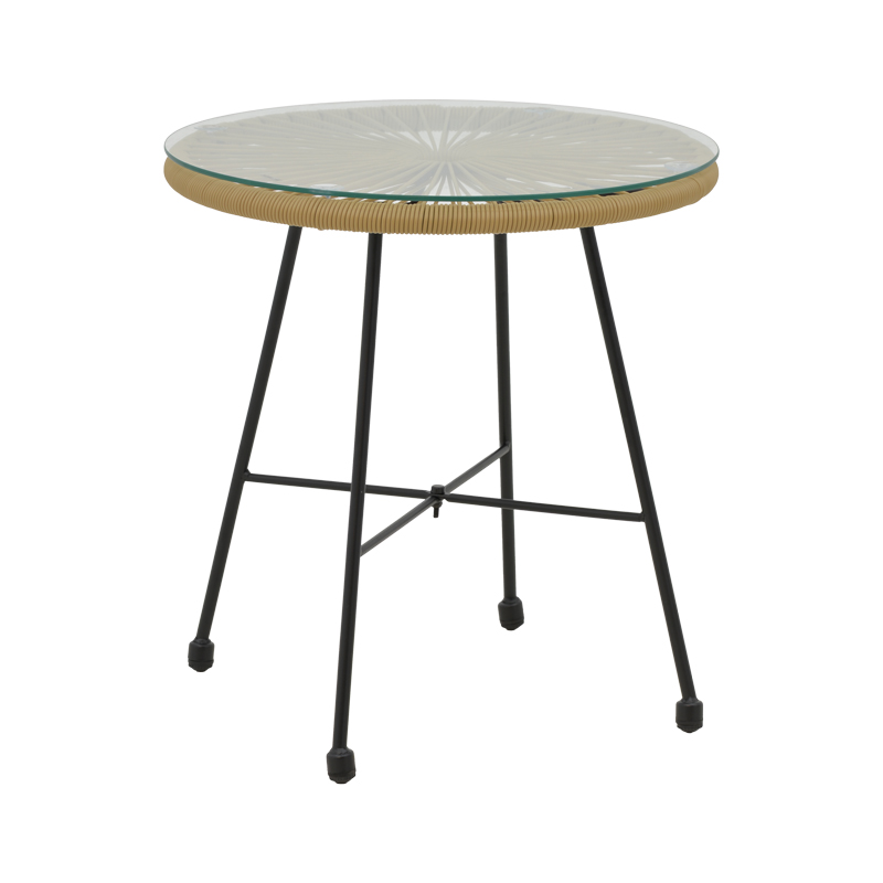 Τραπέζι Acapulco pakoworld μαύρο μέταλλο – pe rattan σε φυσική απόχρωση Φ50×50εκ Διακοσμήστε τον κήπο ή το μπαλκόνι σας με την τελευταία τάση του σύγχρονου design! Το τραπέζι κήπου Acapulco σας προσφέρει άνεση στο κάθισμα αλλά και ανθεκτικότητα χάρη στην εξαιρετική ποιότητα κατασκευής του. Τοποθετήστε το στο μπαλκόνι ή στον κήπο σας και συνδυάστε την αισθητική με την εργονομία.Τεχνικά χαρακτηριστικά: Σταθερός σκελετός από μέταλλο με αντοχή στην καταπόνηση και στη φθορά. Κυρίως σώμα τραπεζιού από εξαιρετικής ποιότητας PE rattan. Το PE rattan είναι ένα είδος οικολογικού συνθετικού rattan, ανακυκλώσιμο και με μεγαλύτερη ανθεκτικότητα σε σχέση με τα άλλα είδη. Μεγάλη ανθεκτικότητα: κατάλληλο για χρήση σε εξωτερικό χώρο εκτεθειμένο σε καιρικές συνθήκες και υγρασία. Προσφέρεται σε χρώμα μαύρο-φυσικό. Γυαλί: 5 χιλ διάφανοΔιαστάσεις προϊόντος: Μήκος: 50 εκ Πλάτος: 50 εκ Ύψος: 50 εκΠαρατηρήσεις: Το προϊόν παραδίδεται σε εργοστασιακή συσκευασία και χρειάζεται μοντάρισμα Η χρωματική απόχρωση του προϊόντος ενδέχεται να διαφέρει ελαφρώς σε σχέση με την φωτογραφική απεικόνισή του στην οθόνη σας.