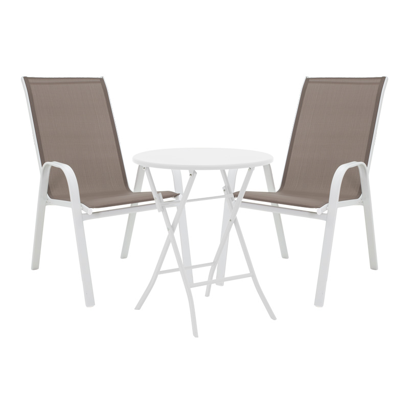 Τραπεζαρία Albero-Calan pakoworld 3τεμ μέταλλο σε λευκή απόχρωση Φ60×70εκ Η τραπεζαρία Albero-Calan συνδυάζει λειτουργικότητα, στυλ και ποιότητα, προσφέροντας μια εξαιρετική λύση για τη διαμόρφωση του εξωετρικού σας χώρου . Aποτελεί μια εξαιρετική επιλογή για όσους αναζητούν ένα κομψό, άνετο και ανθεκτικό σύνολο για να απολαύσουν τον καφέ ή το φαγητό τους, στον κήπο ή το μπαλκονι σας.Το σετ αποτελείται από 2 πολυθρόνες και 1 τραπέζιΤεχνικά χαρακτηριστικά τραπεζιού: Κατασκευασμένο από ανθεκτικό μέταλλο υψηλής αντοχής. Το προϊόν είναι κατάλληλο για εξωτερικούς χώρους. Είναι πτυσσόμενο: έχει την δυνατότητα να αναδιπλώνει και να κλείνει με μία κίνηση προσφέροντας έτσι ευκολία στη μεταφορά και την αποθήκευση. Προσφέρεται σε χρώμα λευκόΔιαστάσεις προϊόντος: Μήκος: 60 εκ Πλάτος: 60 εκ Ύψος: 70 εκΤεχνικά χαρακτηριστικά πολυθρόνας: Σταθερός σκελετός από μέταλλο με αντοχή στην καταπόνηση και στη φθορά. Κυρίως σώμα καρέκλας από εξαιρετικής ποιότητας textilene. Το textilene είναι ύφασμα μεγάλης αντοχής στην ηλιακή ακτινοβολία και την υγρασία ενώ παράλληλα αφήνει το δέρμα να αναπνέει” δημιουργώντας έτσι άνεση στο κάθισμα. Μεγάλη ανθεκτικότητα: κατάλληλο για χρήση σε εξωτερικό χώρο εκτεθειμένο σε καιρικές συνθήκες κι υγρασία. Στοιβαζόμενη: προσφέρει ευκολία στη μεταφορά και την αποθήκευση. Προσφέρεται σε χρώμα λευκό-καφέ.Διαστάσεις προϊόντος: Μήκος: 55 εκ Πλάτος: 75 εκ Ύψος: 90 εκΠαρατηρήσεις: Το προϊόν παραδίδεται μονταρισμένο σε εργοστασιακή συσκευασία. Η χρωματική απόχρωση του προϊόντος ενδέχεται να διαφέρει ελαφρώς σε σχέση με την φωτογραφική απεικόνισή του στην οθόνη σας.”