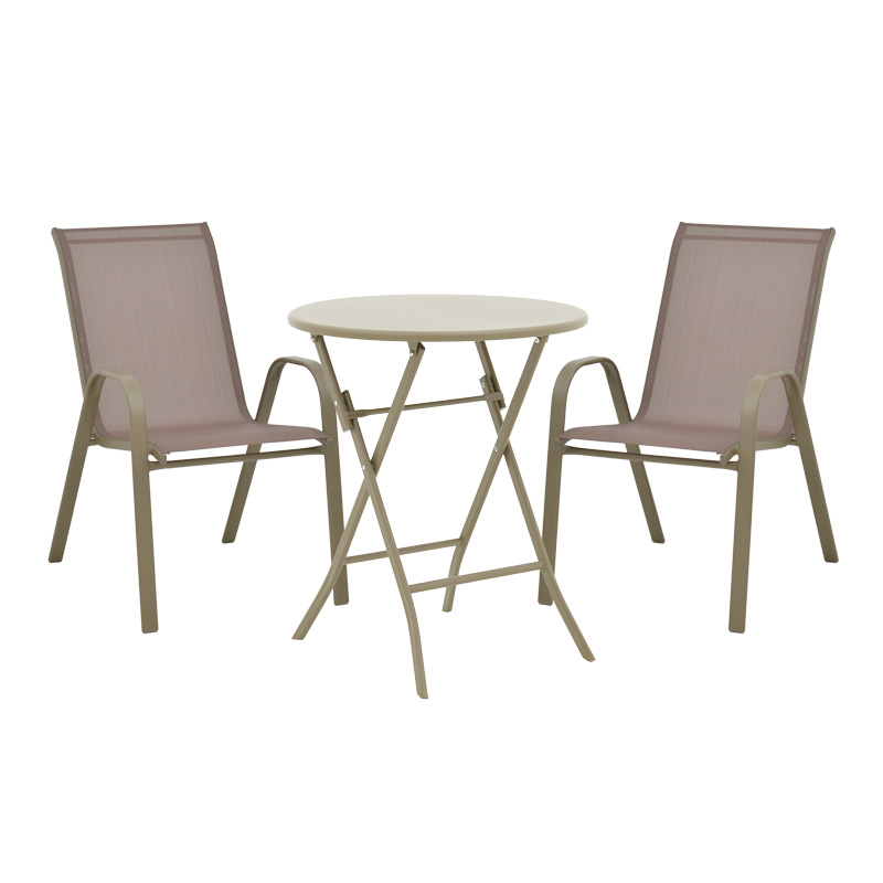 Τραπεζαρία Albero-Calan pakoworld 3τεμ μέταλλο σε σαμπανιζέ απόχρωση Φ60×70εκ Η τραπεζαρία Albero-Calan συνδυάζει λειτουργικότητα, στυλ και ποιότητα, προσφέροντας μια εξαιρετική λύση για τη διαμόρφωση του εξωετρικού σας χώρου . Aποτελεί μια εξαιρετική επιλογή για όσους αναζητούν ένα κομψό, άνετο και ανθεκτικό σύνολο για να απολαύσουν τον καφέ ή το φαγητό τους, στον κήπο ή το μπαλκονι σας.Το σετ αποτελείται από 2 πολυθρόνες και 1 τραπέζιΤεχνικά χαρακτηριστικά τραπεζιού: Κατασκευασμένο από ανθεκτικό μέταλλο υψηλής αντοχής. Το προϊόν είναι κατάλληλο για εξωτερικούς χώρους. Είναι πτυσσόμενο: έχει την δυνατότητα να αναδιπλώνει και να κλείνει με μία κίνηση προσφέροντας έτσι ευκολία στη μεταφορά και την αποθήκευση. Προσφέρεται σε χρώμα σαμπανιζέΔιαστάσεις προϊόντος: Μήκος: 60 εκ Πλάτος: 60 εκ Ύψος: 70 εκΤεχνικά χαρακτηριστικά πολυθρόνας: Σταθερός σκελετός από μέταλλο με αντοχή στην καταπόνηση και στη φθορά. Κυρίως σώμα καρέκλας από εξαιρετικής ποιότητας textilene. Το textilene είναι ύφασμα μεγάλης αντοχής στην ηλιακή ακτινοβολία και την υγρασία ενώ παράλληλα αφήνει το δέρμα να αναπνέει” δημιουργώντας έτσι άνεση στο κάθισμα. Μεγάλη ανθεκτικότητα: κατάλληλο για χρήση σε εξωτερικό χώρο εκτεθειμένο σε καιρικές συνθήκες κι υγρασία. Στοιβαζόμενη: προσφέρει ευκολία στη μεταφορά και την αποθήκευση. Προσφέρεται σε χρώμα champagne.Διαστάσεις προϊόντος: Μήκος: 55 εκ Πλάτος: 75 εκ Ύψος: 90 εκΠαρατηρήσεις: Το προϊόν παραδίδεται μονταρισμένο σε εργοστασιακή συσκευασία. Η χρωματική απόχρωση του προϊόντος ενδέχεται να διαφέρει ελαφρώς σε σχέση με την φωτογραφική απεικόνισή του στην οθόνη σας.”