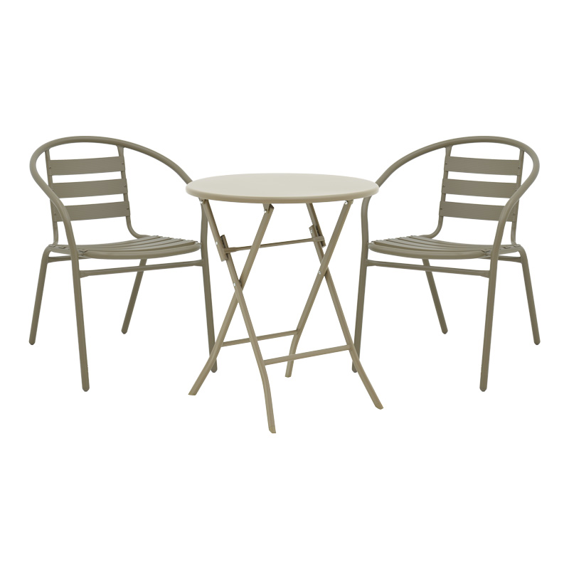 Τραπεζαρία Albero-Tade pakoworld 3τεμ μέταλλο σε σαμπανιζέ απόχρωση Φ60×70εκ Η τραπεζαρία Albero-Tade συνδυάζει λειτουργικότητα, στυλ και ποιότητα, προσφέροντας μια εξαιρετική λύση για τη διαμόρφωση του εξωετρικού σας χώρου . Aποτελεί μια εξαιρετική επιλογή για όσους αναζητούν ένα κομψό, άνετο και ανθεκτικό σύνολο για να απολαύσουν τον καφέ ή το φαγητό τους, στον κήπο ή το μπαλκονι σας.Το σετ αποτελείται από 2 πολυθρόνες και 1 τραπέζιΤεχνικά χαρακτηριστικά τραπεζιού: Κατασκευασμένο από ανθεκτικό μέταλλο υψηλής αντοχής. Το προϊόν είναι κατάλληλο για εξωτερικούς χώρους. Είναι πτυσσόμενο: έχει την δυνατότητα να αναδιπλώνει και να κλείνει με μία κίνηση προσφέροντας έτσι ευκολία στη μεταφορά και την αποθήκευση. Προσφέρεται σε χρώμα σαμπανιζέ.Διαστάσεις προϊόντος: Μήκος: 60 εκ Πλάτος: 60 εκ Ύψος: 70 εκΤεχνικά χαρακτηριστικά πολυθρόνας: Σταθερός σκελετός από μέταλλο με αντοχή στην καταπόνηση και στη φθορά. Μεγάλη ανθεκτικότητα: κατάλληλο για χρήση σε εξωτερικό χώρο εκτεθειμένο σε καιρικές συνθήκες κι υγρασία. Στοιβαζόμενη: προσφέρει ευκολία στη μεταφορά και την αποθήκευση. Προσφέρεται σε χρώμα σαμπανιζέ.Διαστάσεις προϊόντος: Μήκος: 54 εκ Πλάτος: 62 εκ Ύψος: 74 εκ Ύψος έδρας: 42 εκΠαρατηρήσεις: Το προϊόν παραδίδεται μονταρισμένο σε εργοστασιακή συσκευασία. Η χρωματική απόχρωση του προϊόντος ενδέχεται να διαφέρει ελαφρώς σε σχέση με την φωτογραφική απεικόνισή του στην οθόνη σας.