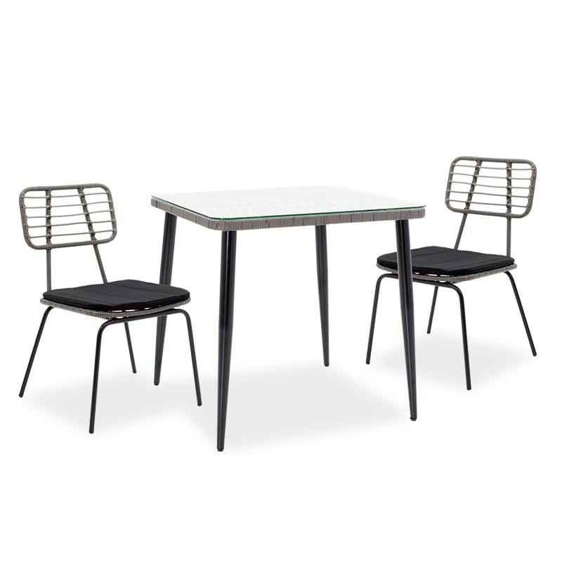 Τραπεζαρία Naoki σετ 3τεμ pakoworld μαύρο μέταλλο-pe γκρι Τραπεζαρία κήπου Naoki σετ 3τεμ pakoworld μαύρο μέταλλο-pe γκριΘέλετε ένα ανθεκτικό σετ τραπεζαρίας για το μπαλκόνι ή τον κήπο σας που θα αναβαθμίσει αισθητικά το χώρο σας; Η σειρά Naoki είναι ιδανική για εσάς καθώς συνδυάζει την αισθητική με την ποιότητα κατασκευής.Το σετ περιλαμβάνει δύο καρέκλες και ένα τραπέζι.Τεχνικά χαρακτηριστικά: Σταθερός σκελετός από εξαιρετικής ποιότητας μέταλλο (πόδια D50mm) με αντοχή στην καταπόνηση και στη φθορά. Κυρίως επιφάνεια τραπεζιού και πολυθρόνας από PE rattan. Το PE rattan είναι ένα είδος οικολογικού συνθετικού rattan, ανακυκλώσιμο και με μεγαλύτερη ανθεκτικότητα σε σχέση με τα άλλα είδη. Το τραπέζι φέρει tempered γυαλί 6χιλ – διάφανο. Μεγάλη ανθεκτικότητα: κατάλληλο για χρήση σε εξωτερικό χώρο εκτεθειμένο στις καιρικές συνθήκες και την υγρασία. Προσφέρεται σε χρώμα: Γκρι – Μαύρο. Η πολυθρόνα φέρει μαξιλαράκι για την έδρα του 2εκ σε μαύρο χρώμα το οποίο διαθέτει φερμουάρ.Διαστάσεις προϊόντων:Διάσταση τραπεζιού: Μήκος: 80 εκ. Πλάτος: 80 εκ. Ύψος: 78 εκ.Διάσταση πολυθρόνας: Μήκος: 46,5 εκ. Πλάτος: 55 εκ. Ύψος: 85 εκ. Ύψος έδρας: 44 εκ.Πληροφορίες υλικών: PE Rattan: Είναι ένα δημοφιλές υλικό, απομίμηση φυσικού rattan, που χρησιμοποιείται στην κατασκευή επίπλων και αξεσουάρ. Κατασκευάζεται από πολυαιθυλένιο (polyethylene), το οποίο είναι μια ανθεκτική συνθετική πολυμερής ρητίνη. Είναι ανθεκτικό στις καιρικές συνθήκες, δεν φθείρεται από τον ήλιο ή τη βροχή και δεν ξεθωριάζει, ενώ παράλληλα είναι φιλικό προς το περιβάλλον. Tempered glass- Γυαλί ασφαλείας: Το tempered glass, γνωστό και ως σκληρυμένο ή θερμικά επεξεργασμένο γυαλί, είναι ένα είδος γυαλιού ασφαλείας που έχει υποστεί ειδική επεξεργασία για να αυξήσει την αντοχή του σε σύγκριση με το απλό γυαλί. Η διαδικασία θερμικής επεξεργασίας περιλαμβάνει τη θέρμανση του γυαλιού σε υψηλή θερμοκρασία και την απότομη ψύξη του. Αυτό δημιουργεί μια τάση συμπίεσης στην επιφάνεια του γυαλιού και μια τάση εφελκυσμού στο εσωτερικό, καθιστώντας το πιο ανθεκτικό σε κρούσεις, θερμικά σοκ και γρατζουνιές. Eίναι περίπου 5 φορές πιο ανθεκτικό από το απλό γυαλί σε κρούσεις. Ένα σημαντικό πλεονέκτημα είναι πως σε περίπτωση θραύσης, το tempered glass θρυμματίζεται σε μικρά, αμβλεία θραύσματα, μειώνοντας τον κίνδυνο σοβαρού τραυματισμού. Χρησιμοποιείται σε τραπέζια, γραφεία, έπιπλα τηλεόρασης κ.ά. Μέταλλο: Το μέταλλο χρησιμοποιείται ευρέως στην κατασκευή επίπλων, προσφέροντας μια σειρά από πλεονεκτήματα σε σχέση με άλλα υλικά. Είναι εξαιρετικά ανθεκτικό σε φθορές, ιδανικό για έπιπλα που προορίζονται για καθημερινή χρήση σε ένα απαιτητικό περιβάλλον. Διατηρεί το σχήμα και τη δομή του άψογα, εξασφαλίζοντας σταθερότητα και μακροζωία στα έπιπλα. Εκτός από τις ιδιότητες που αναφέρθηκαν παραπάνω, το μέταλλο μπορεί να έχει και άλλα χαρακτηριστικά, όπως η αντιμικροβιακή δράση (χαλκός) ή υπεραγωγιμότητα (μολυβδένιο). Ύφασμα μαξιλαριού: Το ύφασμα είναι ένα ευέλικτο υλικό που κατασκευάζεται από την ύφανση, πλέξιμο, βελονιά ή συγκόλληση ινών. Αυτές οι ίνες μπορεί να είναι φυσικές, όπως βαμβάκι, μαλλί ή μετάξι, ή συνθετικές, όπως πολυεστέρας ή νάιλον. Η ύφανση των ινών δημιουργεί ένα δίκτυο που δίνει στο ύφασμα τις ιδιότητές του, όπως η αντοχή, η απαλότητα, η διαπνοή και η ελαστικότητα. Υπάρχουν άπειρες ποικιλίες υφασμάτων, καθεμιά με τα δικά της μοναδικά χαρακτηριστικά και χρήσεις.Οδηγίες συντήρησης: 