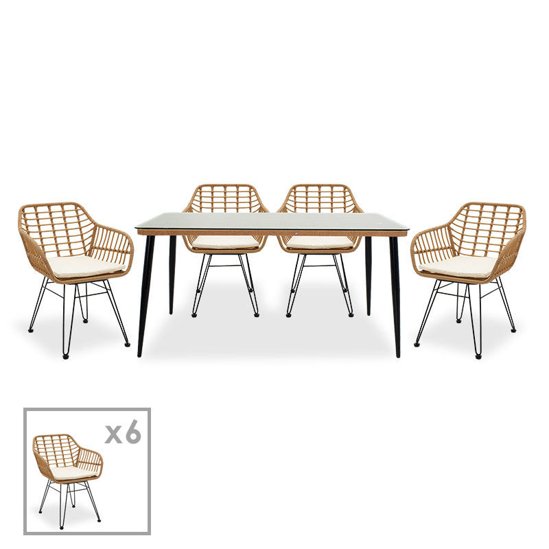 Τραπεζαρία Naoki σετ 7τεμ pakoworld μέταλλο-μαύρο-pe φυσικό Τραπεζαρία κήπου Naoki σετ 7τεμ pakoworld μέταλλο-μαύρο-pe φυσικόΘέλετε ένα ανθεκτικό σετ τραπεζαρίας για το μπαλκόνι ή τον κήπο σας που θα αναβαθμίσει αισθητικά το χώρο σας; Η σειρά Naoki είναι ιδανική για εσάς καθώς συνδυάζει την αισθητική με την ποιότητα κατασκευής. Το σετ περιλαμβάνει έξι πολυθρόνες και ένα τραπέζι. Τεχνικά χαρακτηριστικά: Σταθερός σκελετός από εξαιρετικής ποιότητας μέταλλο (πόδια D50mm) με αντοχή στην καταπόνηση και στη φθορά. Κυρίως επιφάνεια τραπεζιού και πολυθρόνας από PE rattan. Το PE rattan είναι ένα είδος οικολογικού συνθετικού rattan, ανακυκλώσιμο και με μεγαλύτερη ανθεκτικότητα σε σχέση με τα άλλα είδη. Η πολυθρόνα φέρει μαξιλαράκι για την έδρα του καθίσματος 2εκ σε λευκό ivory χρώμα. Το τραπέζι φέρει tempered γυαλί 6χιλ – διάφανο. Μεγάλη ανθεκτικότητα: κατάλληλο για χρήση σε εξωτερικό χώρο εκτεθειμένο στις καιρικές συνθήκες και την υγρασία. Προσφέρεται σε χρώμα: Φυσικό – Μαύρο.Διαστάσεις προϊόντων:Διάσταση τραπεζιού: Μήκος: 160 εκ. Πλάτος: 90 εκ. Ύψος: 78 εκ.Διάσταση πολυθρόνας: Μήκος: 59 εκ. Πλάτος: 57 εκ. Ύψος: 81 εκ. Ύψος έδρας: 43 εκ.Πληροφορίες υλικών: PE Rattan: Είναι ένα δημοφιλές υλικό, απομίμηση φυσικού rattan, που χρησιμοποιείται στην κατασκευή επίπλων και αξεσουάρ. Κατασκευάζεται από πολυαιθυλένιο (polyethylene), το οποίο είναι μια ανθεκτική συνθετική πολυμερής ρητίνη. Είναι ανθεκτικό στις καιρικές συνθήκες, δεν φθείρεται από τον ήλιο ή τη βροχή και δεν ξεθωριάζει, ενώ παράλληλα είναι φιλικό προς το περιβάλλον. Tempered glass- Γυαλί ασφαλείας: Το tempered glass, γνωστό και ως σκληρυμένο ή θερμικά επεξεργασμένο γυαλί, είναι ένα είδος γυαλιού ασφαλείας που έχει υποστεί ειδική επεξεργασία για να αυξήσει την αντοχή του σε σύγκριση με το απλό γυαλί. Η διαδικασία θερμικής επεξεργασίας περιλαμβάνει τη θέρμανση του γυαλιού σε υψηλή θερμοκρασία και την απότομη ψύξη του. Αυτό δημιουργεί μια τάση συμπίεσης στην επιφάνεια του γυαλιού και μια τάση εφελκυσμού στο εσωτερικό, καθιστώντας το πιο ανθεκτικό σε κρούσεις, θερμικά σοκ και γρατζουνιές. Eίναι περίπου 5 φορές πιο ανθεκτικό από το απλό γυαλί σε κρούσεις. Ένα σημαντικό πλεονέκτημα είναι πως σε περίπτωση θραύσης, το tempered glass θρυμματίζεται σε μικρά, αμβλεία θραύσματα, μειώνοντας τον κίνδυνο σοβαρού τραυματισμού. Χρησιμοποιείται σε τραπέζια, γραφεία, έπιπλα τηλεόρασης κ.ά. Μέταλλο: Το μέταλλο χρησιμοποιείται ευρέως στην κατασκευή επίπλων, προσφέροντας μια σειρά από πλεονεκτήματα σε σχέση με άλλα υλικά. Είναι εξαιρετικά ανθεκτικό σε φθορές, ιδανικό για έπιπλα που προορίζονται για καθημερινή χρήση σε ένα απαιτητικό περιβάλλον. Διατηρεί το σχήμα και τη δομή του άψογα, εξασφαλίζοντας σταθερότητα και μακροζωία στα έπιπλα. Εκτός από τις ιδιότητες που αναφέρθηκαν παραπάνω, το μέταλλο μπορεί να έχει και άλλα χαρακτηριστικά, όπως η αντιμικροβιακή δράση (χαλκός) ή υπεραγωγιμότητα (μολυβδένιο). Ύφασμα μαξιλαριού: Το ύφασμα είναι ένα ευέλικτο υλικό που κατασκευάζεται από την ύφανση, πλέξιμο, βελονιά ή συγκόλληση ινών. Αυτές οι ίνες μπορεί να είναι φυσικές, όπως βαμβάκι, μαλλί ή μετάξι, ή συνθετικές, όπως πολυεστέρας ή νάιλον. Η ύφανση των ινών δημιουργεί ένα δίκτυο που δίνει στο ύφασμα τις ιδιότητές του, όπως η αντοχή, η απαλότητα, η διαπνοή και η ελαστικότητα. Υπάρχουν άπειρες ποικιλίες υφασμάτων, καθεμιά με τα δικά της μοναδικά χαρακτηριστικά και χρήσεις.Οδηγίες συντήρησης: PE Rat