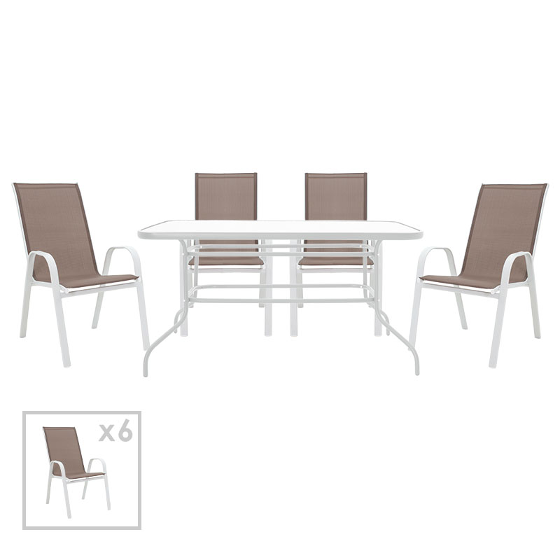 Τραπεζαρία Valor-Calan σετ 7τεμ pakoworld μέταλλο λευκό-textilene καφέ Θέλετε ένα ανθεκτικό σετ τραπεζαρίας για το μπαλκόνι ή τον κήπο σας που θα αναβαθμίσει αισθητικά το χώρο σας; Η σειρά Valor-Obbi είναι ιδανική για εσάς καθώς συνδυάζει την αισθητική με την ποιότητα κατασκευής.Το σετ αποτελείται από έξι πολυθρόνες και ένα τραπέζι Τεχνικά χαρακτηριστικά τραπεζιού: Σταθερός σκελετός από εξαιρετικής ποιότητας μέταλλο με αντοχή στην καταπόνηση και στη φθορά. Φέρει στρογγυλεμένες γωνίες για την αποφυγή τραυματισμών. Κυρίως επιφάνεια τραπεζιού από tempered φιμέ γυαλί. Μεγάλη ανθεκτικότητα: κατάλληλο για χρήση σε εξωτερικό χώρο εκτεθειμένο σε καιρικές συνθήκες κι υγρασία. Προσφέρεται σε χρώμα λευκό. Διαστάσεις προϊόντος: Μήκος: 140 εκ Πλάτος: 80 εκ Yψος: 70 εκ Τεχνικά χαρακτηριστικά πολυθρόνας: Σταθερός σκελετός από μέταλλο με αντοχή στην καταπόνηση και στη φθορά. Κυρίως σώμα καρέκλας από εξαιρετικής ποιότητας textilene. Το textilene είναι ύφασμα μεγάλης αντοχής στην ηλιακή ακτινοβολία και την υγρασία ενώ παράλληλα αφήνει το δέρμα να αναπνέει” δημιουργώντας έτσι άνεση στο κάθισμα. Μεγάλη ανθεκτικότητα: κατάλληλο για χρήση σε εξωτερικό χώρο εκτεθειμένο σε καιρικές συνθήκες κι υγρασία. Στοιβαζόμενη: προσφέρει ευκολία στη μεταφορά και την αποθήκευση. Προσφέρεται σε χρώμα λευκό-καφέΔιαστάσεις προϊόντος: Μήκος: 55 εκ Πλάτος: 75 εκ Ύψος: 95 εκ Ύψος έδρας: 43 εκ Μέγιστο Βάρος: 160 κιλά Παρατηρήσεις: Οι πολυθρόνες παραδίδονται μονταρισμένες ενώ το τραπέζι χρειάζεται μοντάρισμα Η χρωματική απόχρωση του προϊόντος ενδέχεται να διαφέρει ελαφρώς σε σχέση με την φωτογραφική απεικόνισή του στην οθόνη σας. “