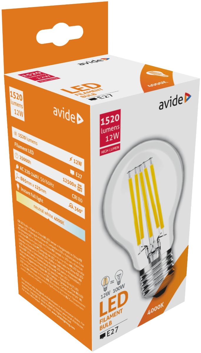 Ονομα : Avide LED Filament Κοινή 12W E27 A65 360° Λευκό 4000K Υψηλής Φωτεινότητας