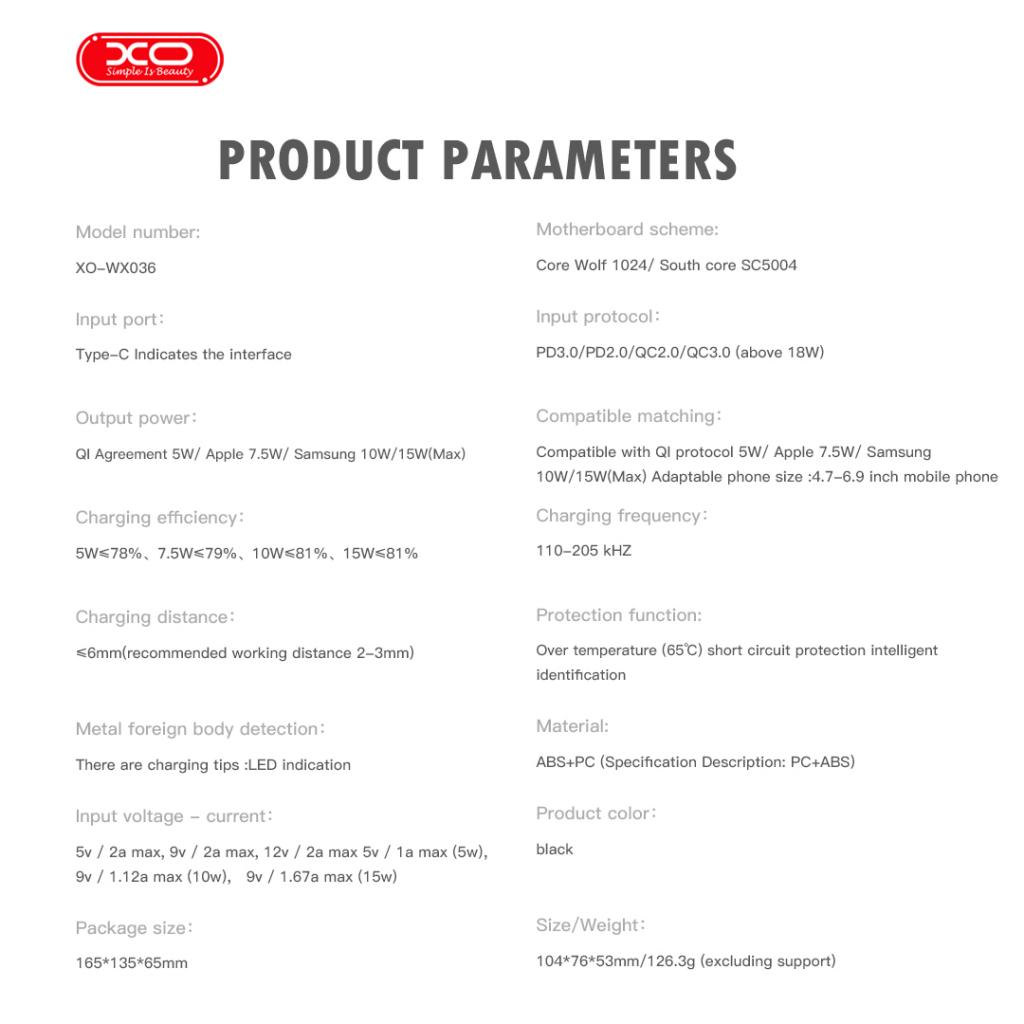 Θύρα εισόδου: Διασύνδεση τύπου C Ρεύμα τάσης εισόδου: 5V/2A MAX, 9V/2A MAX, 12V/2A MAX που αντιστοιχεί σε έξοδο ασύρματης φόρτισης 5V/1A MAX (5W), 9V/1.12A MAX (10W), 9V/1.67A MAX (15W) Πρωτόκολλο εισόδου: PD3.0/PD2.0/QC2.0/QC3.0 (πάνω από 18W)